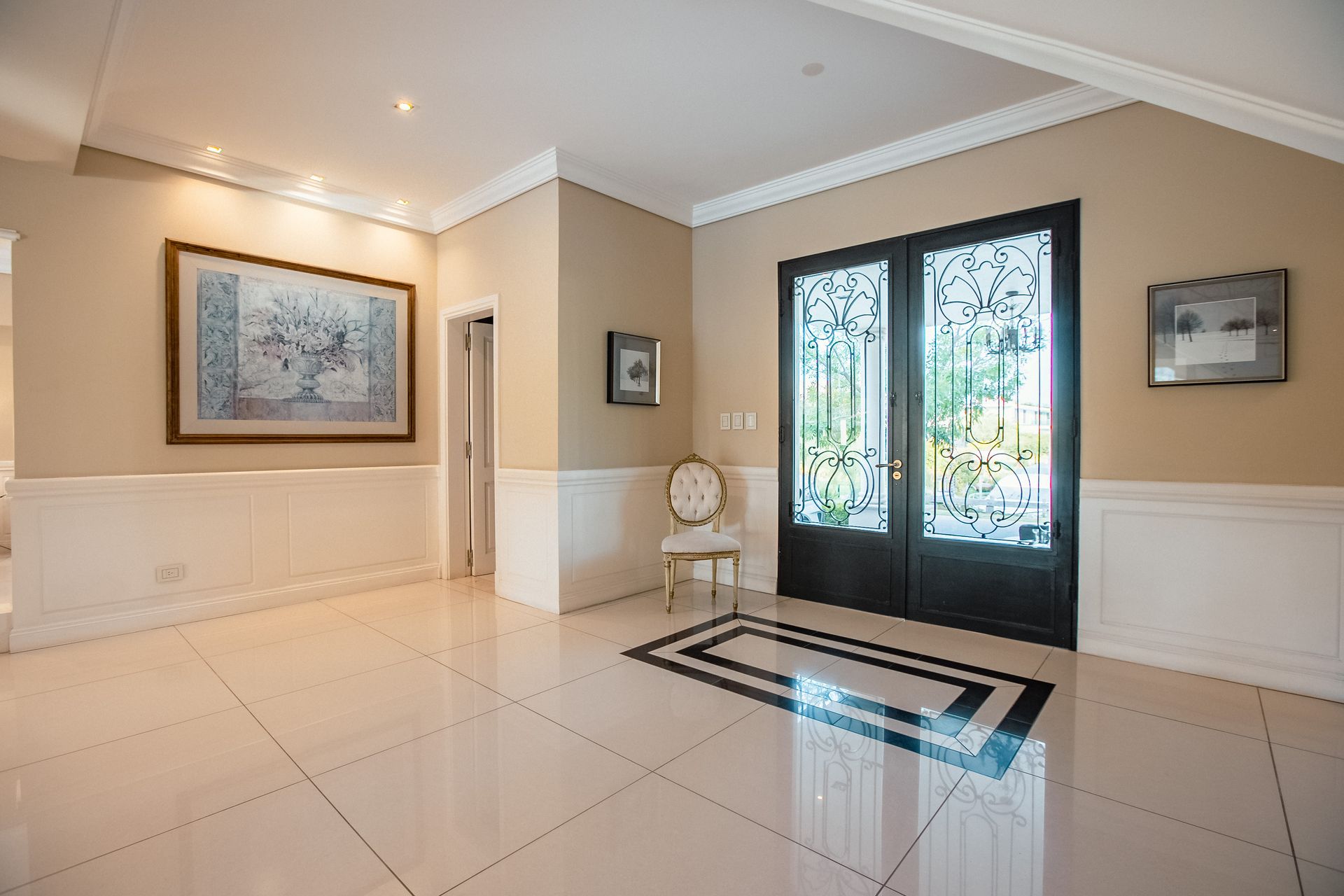 On the upper floor, an elegant marble staircase leads to a spacious distribution hall. The floor houses four bedrooms. The master suite, of outstanding dimensions, features two walk‑in closets and a sophisticated bathroom with double showerheads, marble countertop, shower enclosure and jacuzzi. It also has a double balcony‑terrace, overlooking the river both front and rear. The junior suite has a walk‑in closet, a bathroom with jacuzzi and access to a balcony‑terrace. Two additional bedrooms share a full bathroom, completing the floor.