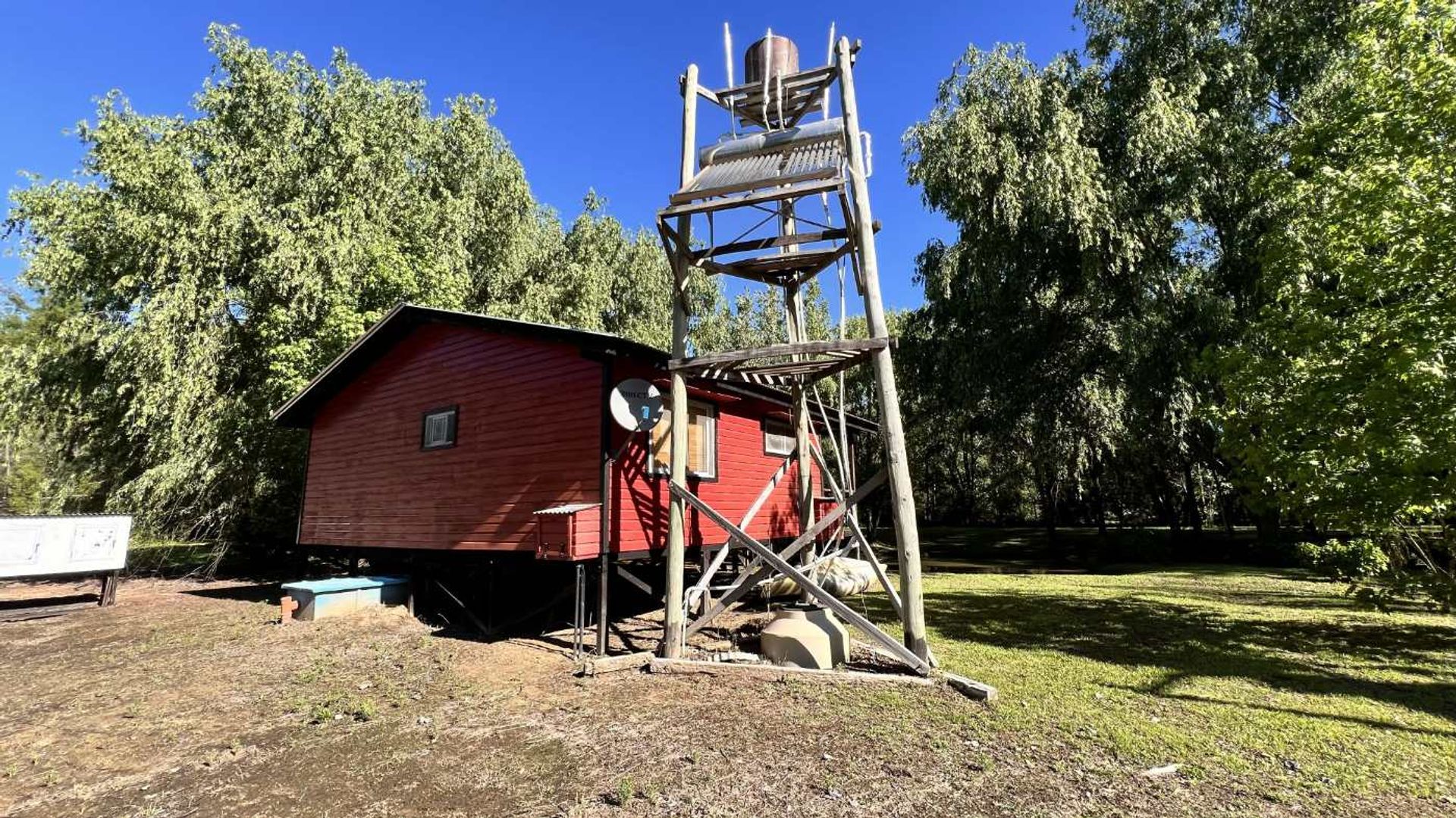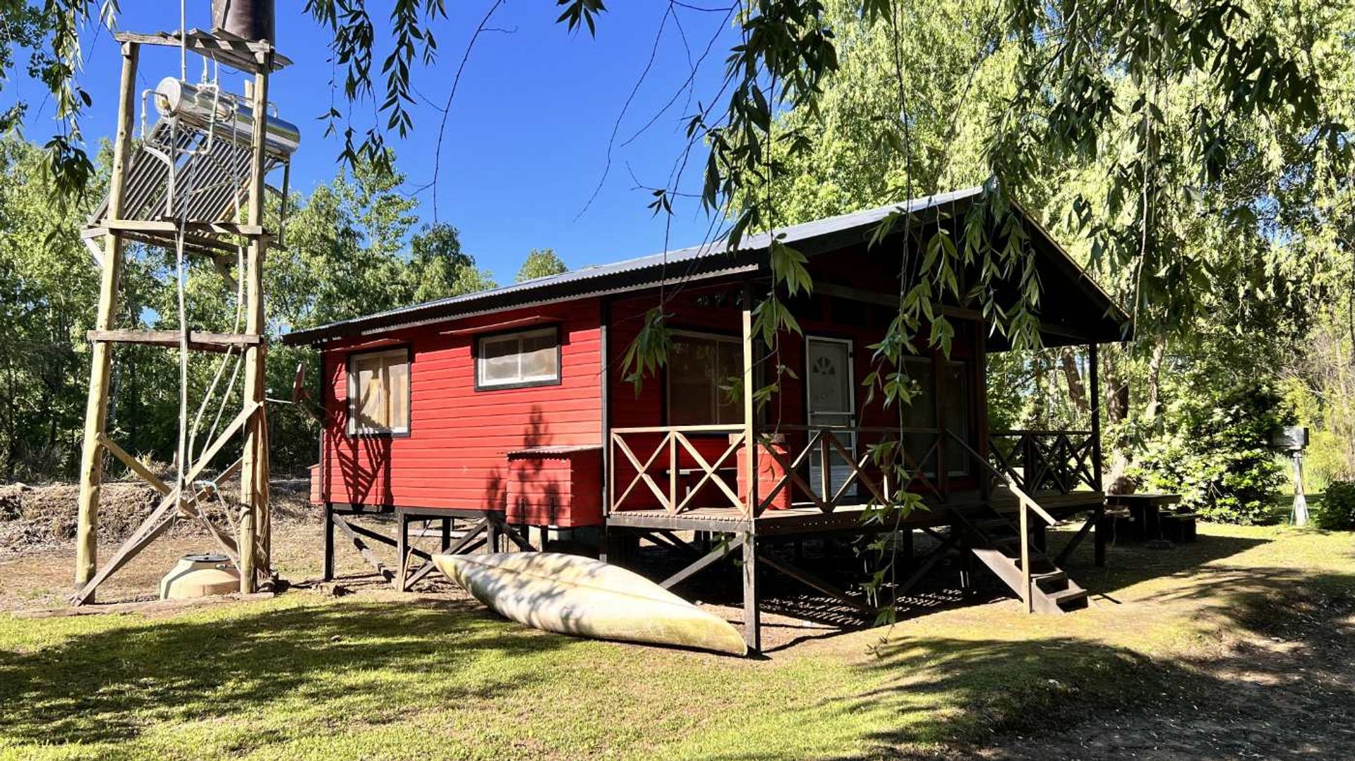 The lot, 850 m² of unpaved sand, offers full utilization of the land and is built vertically with a foundation of quebracho posts that guarantee solidity and durability. The cabin, meticulously maintained and painted inside and out, features an intelligent layout that includes two bedrooms, a full bathroom with bathtub and shower, built‑in storage furniture, and a complete kitchen with a lower counter.