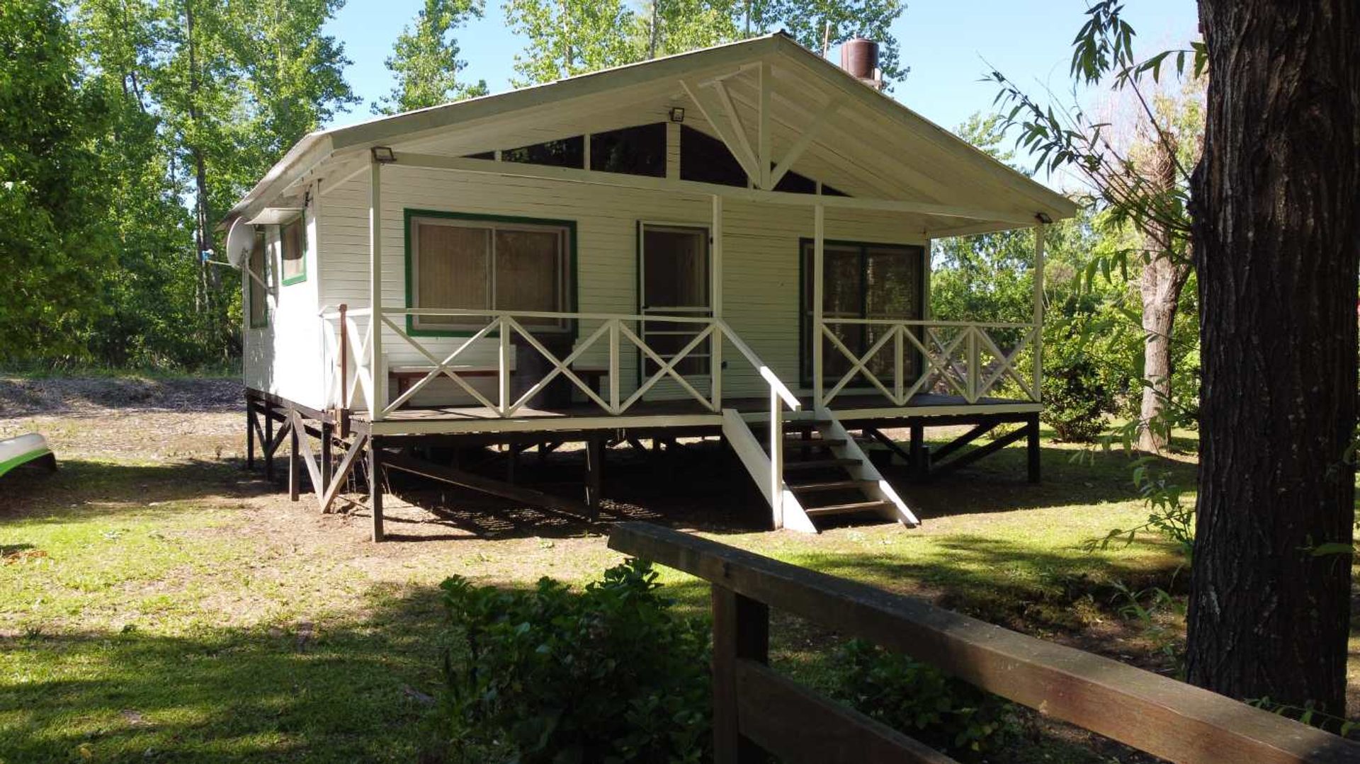 The 850 m² plot is entirely covered with sand, without bath, ensuring a fully usable and erosion‑protected space. The cabin, built on a raised platform, stands out for its excellent maintenance and spatial layout. Its structure features quebracho posts at the base, and both exterior and interior have been painted with up‑to‑date maintenance.