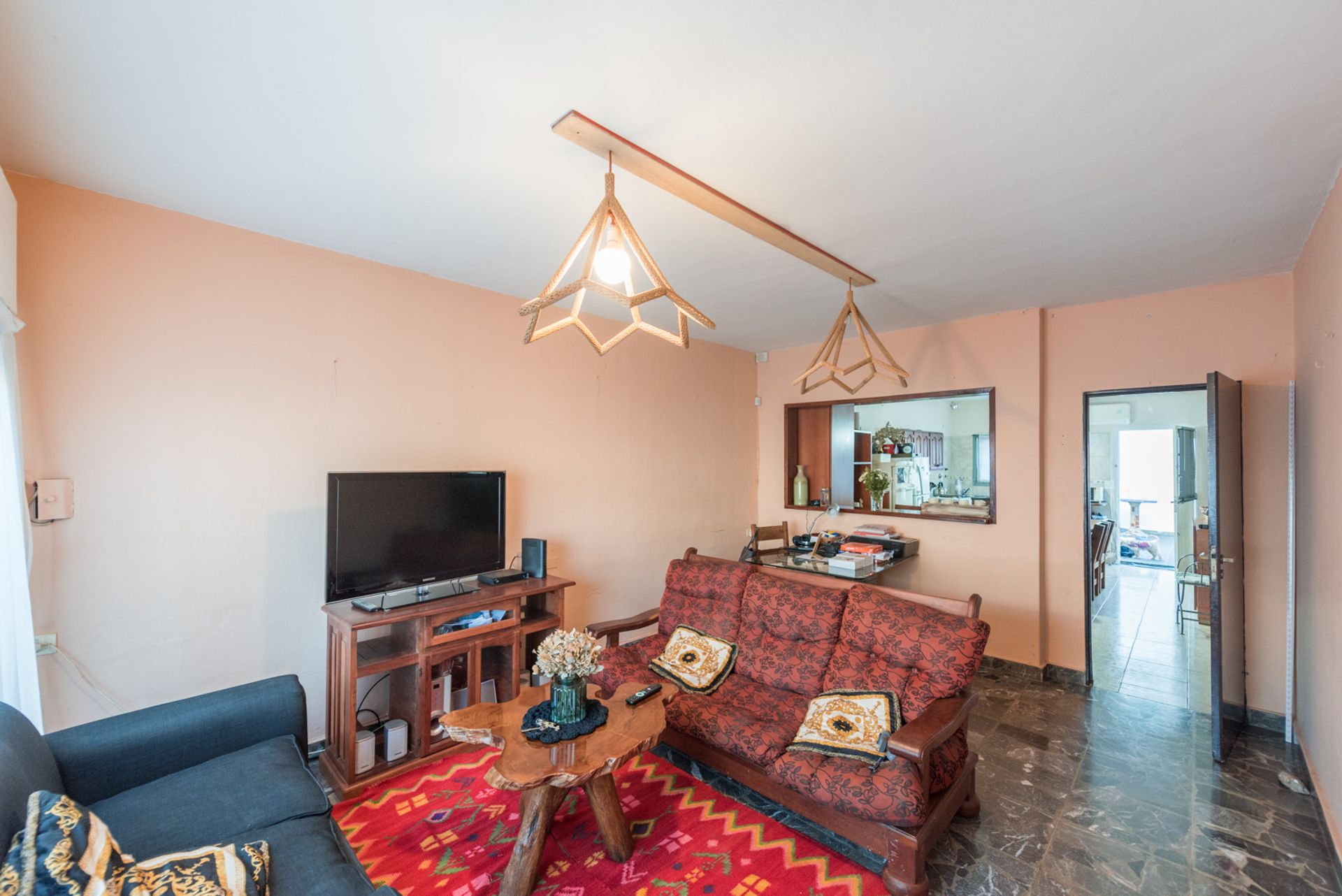 The property is a single‑family home on its own lot, in excellent overall condition and currently occupied, requiring no relocation. It is eligible for financing and intended for residential use. It features three main rooms: a spacious living room with dining area, a generously sized integrated kitchen, and a front patio opening onto a tiled terrace. The home includes two bedrooms, two full bathrooms (one located in the garage), and a second bathroom within the same garage, which also provides space for a covered parking area that can accommodate up to three cars.
