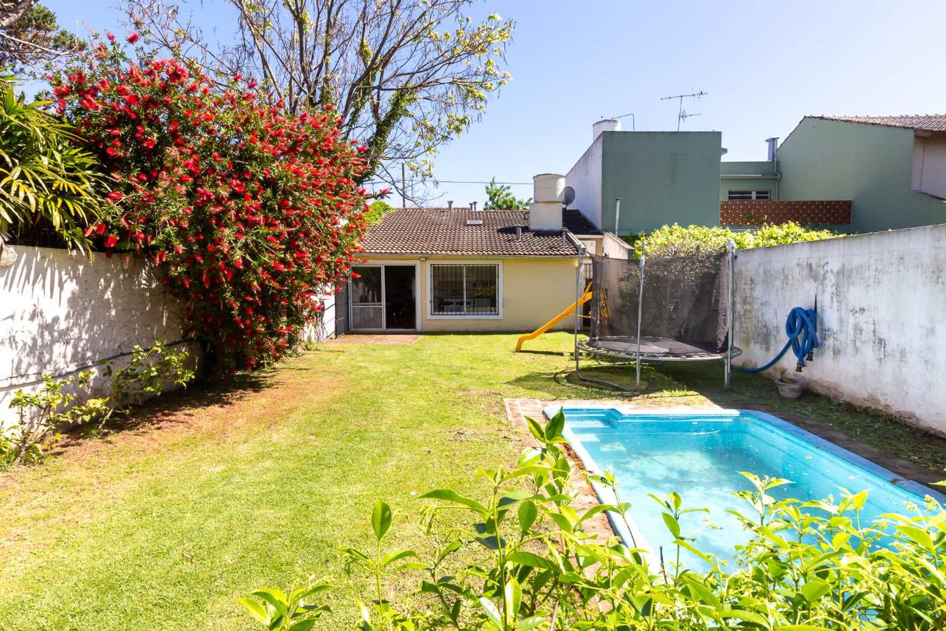 The expansive garden includes a pool, ideal for enjoying the Argentine climate. Additionally, there is a covered parking area, ensuring convenience and protection.