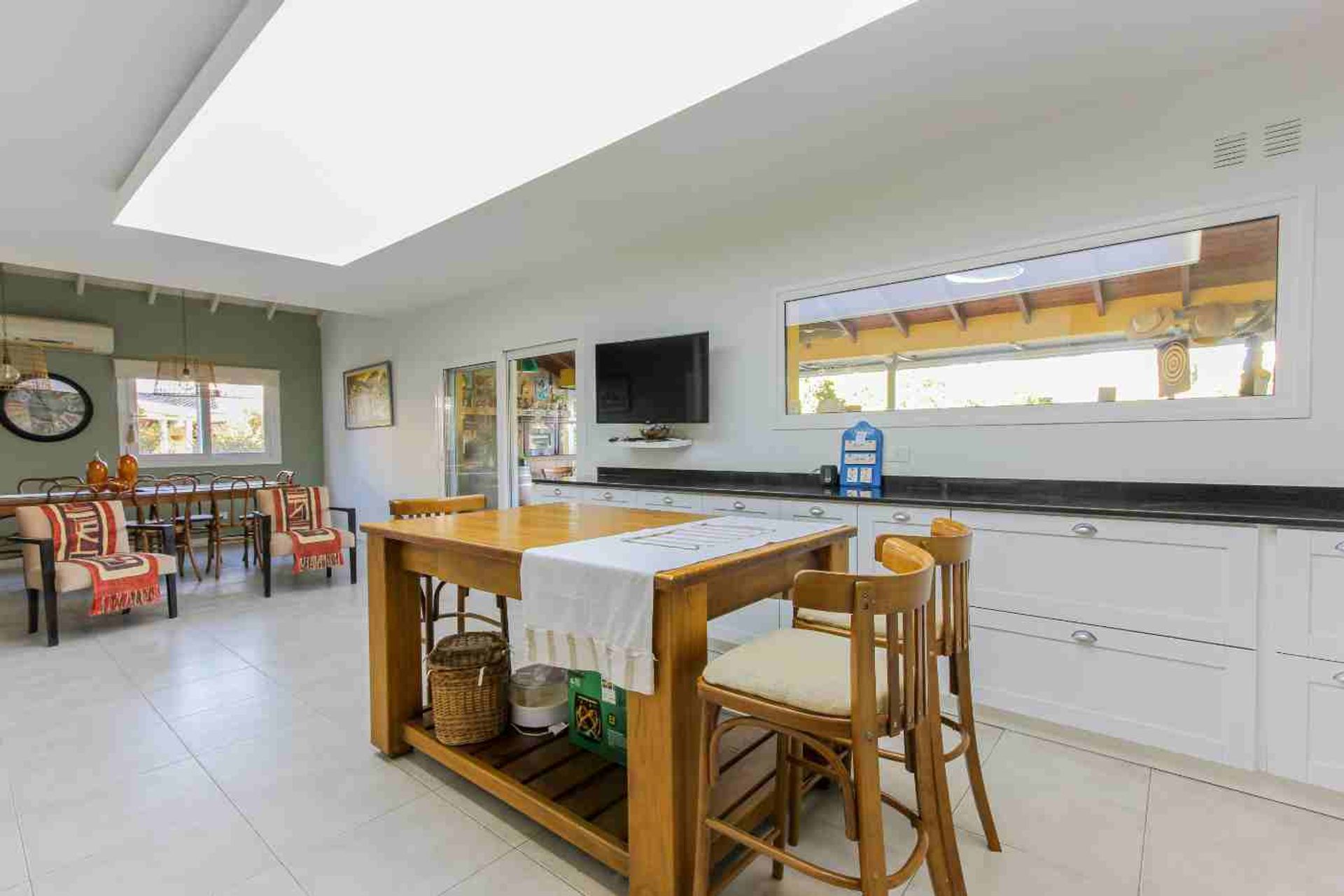 Upon entry, a warm living area invites conviviality. The dayroom dining area integrates with the kitchen, which opens to the exterior and is naturally illuminated. A spacious gallery, equipped with a grill, sink, and laundry connection, provides a versatile space for gatherings and entertainment.