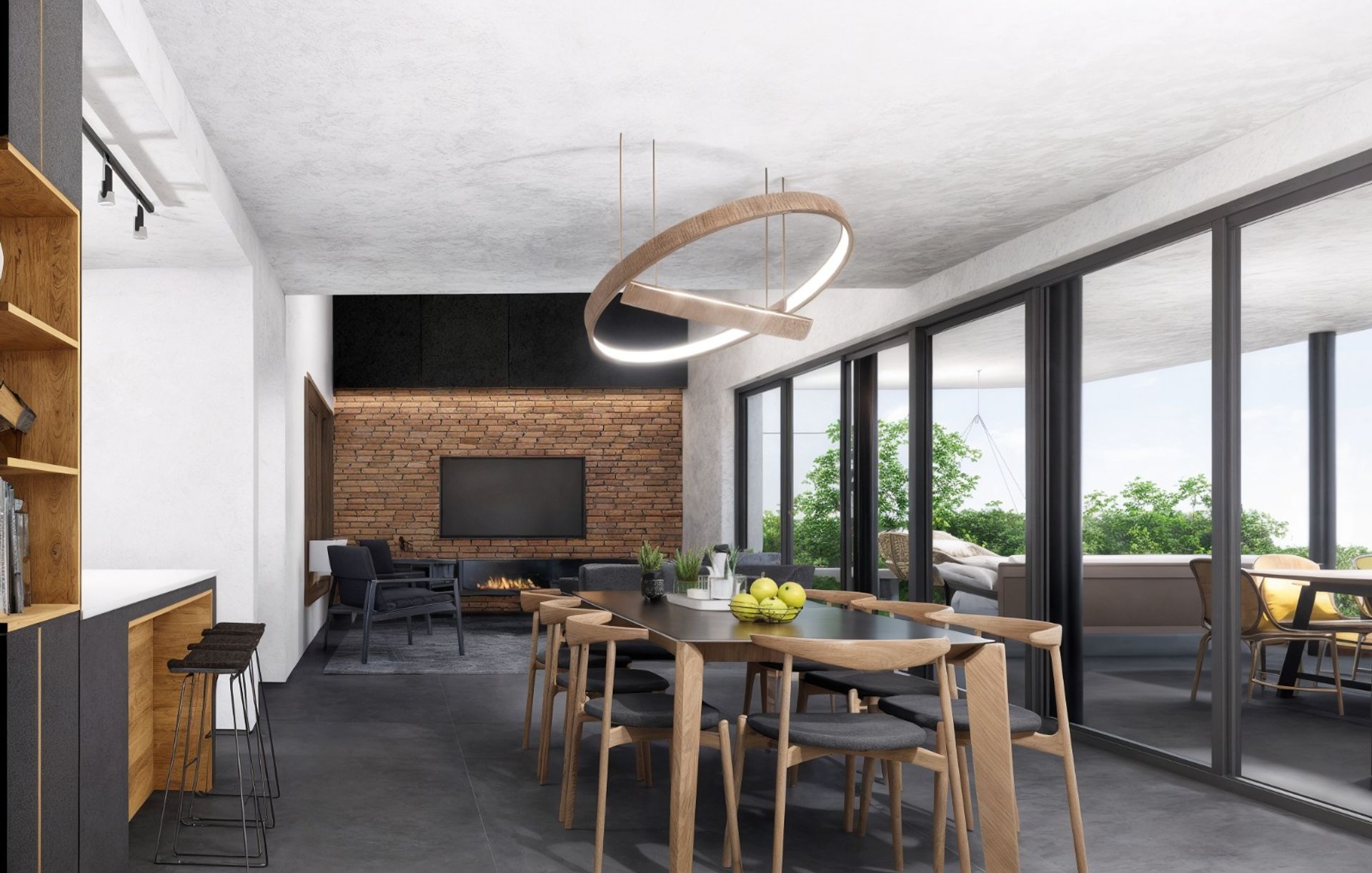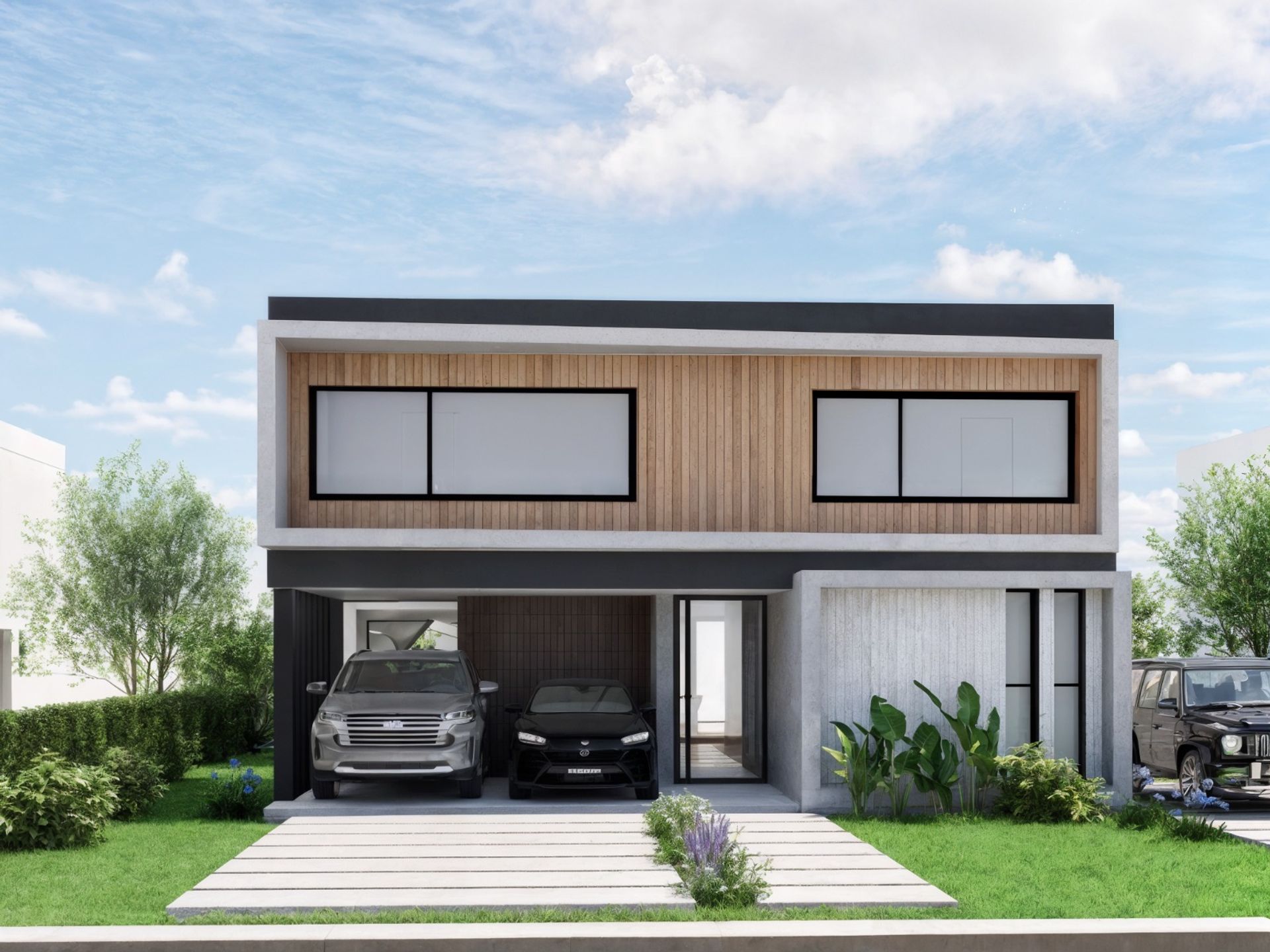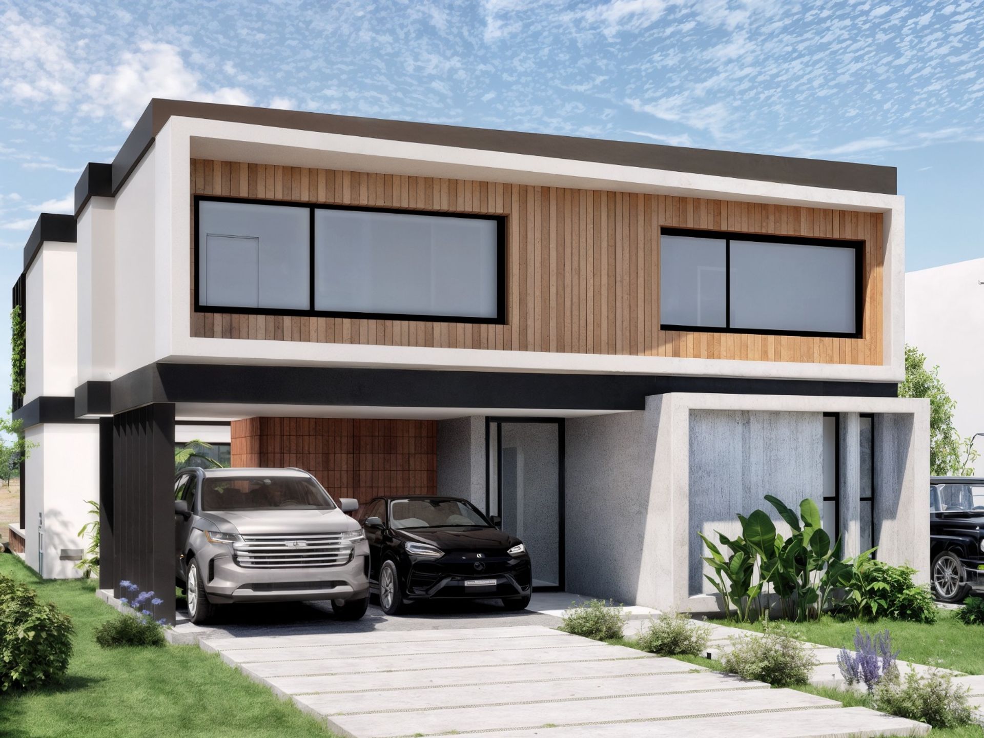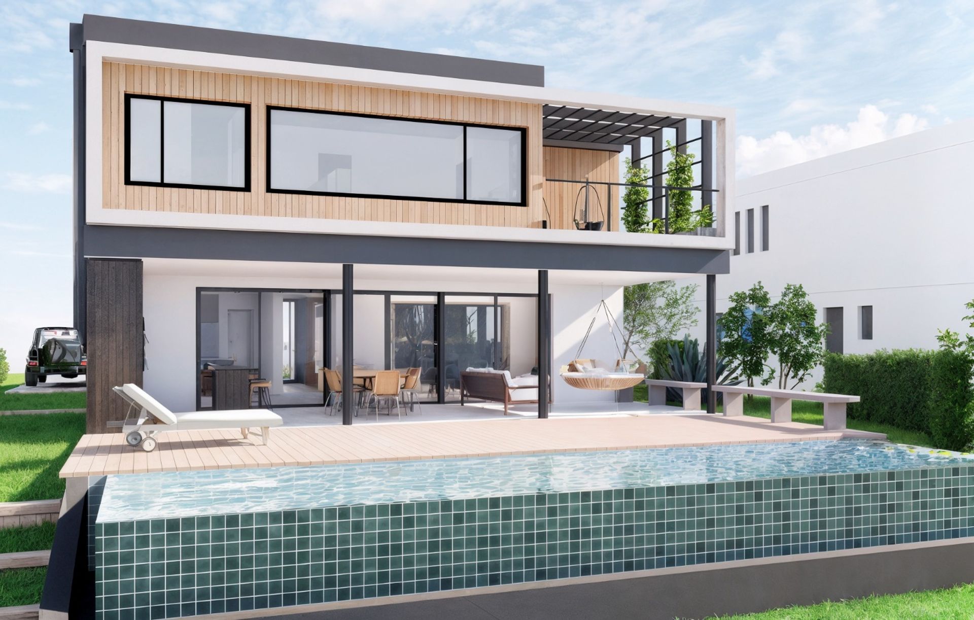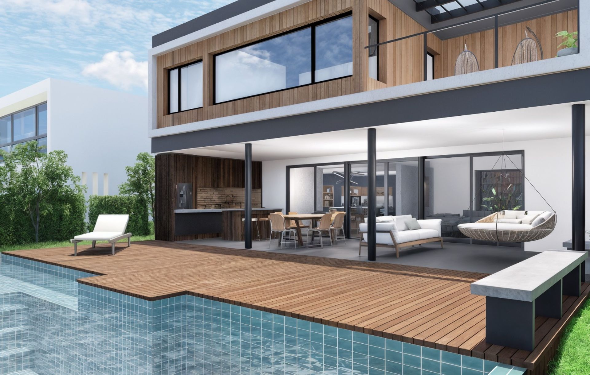 The exterior is complemented by an uncovered two‑car garage, an infinity‑edge pool that harmoniously integrates with the surroundings, and a wooden deck that extends the social area into the garden, creating a perfect space for leisure and relaxation.
