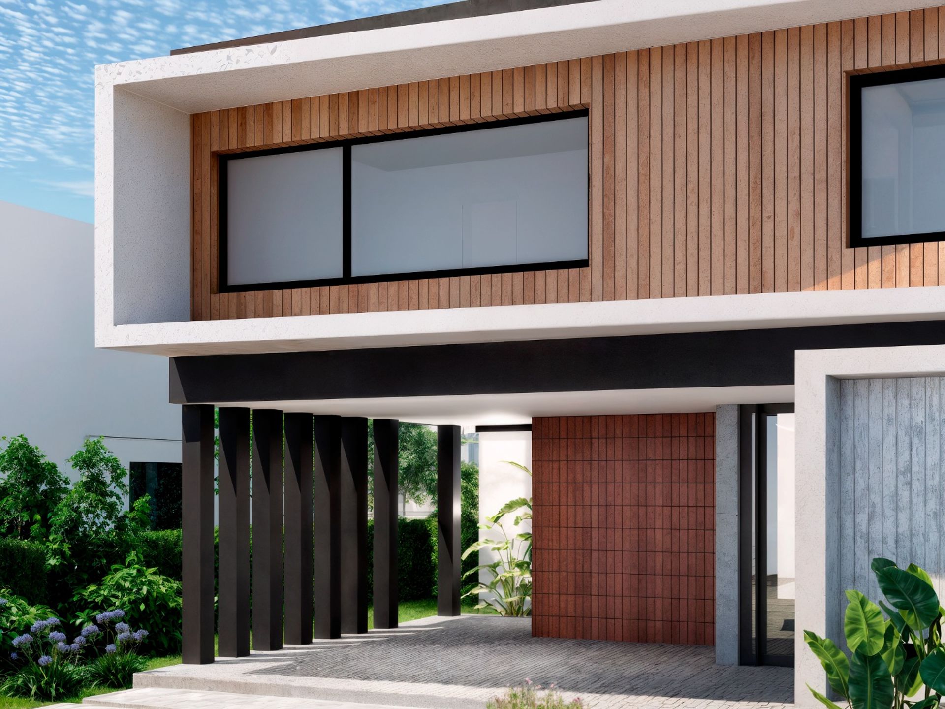 On the upper floor are the bedrooms, including a master suite with walk‑in wardrobe and private bathroom, and two secondary en‑suite bedrooms. Additionally, there is space dedicated to a study. All rooms are designed to maximize natural light and cross‑ventilation. From the upper level, a private terrace with a metal pergola provides an ideal setting for outdoor moments with open views.