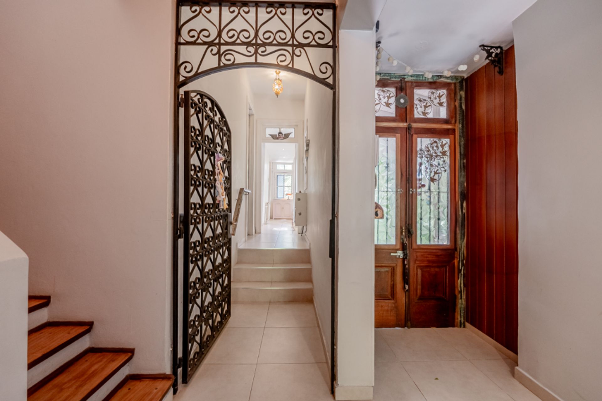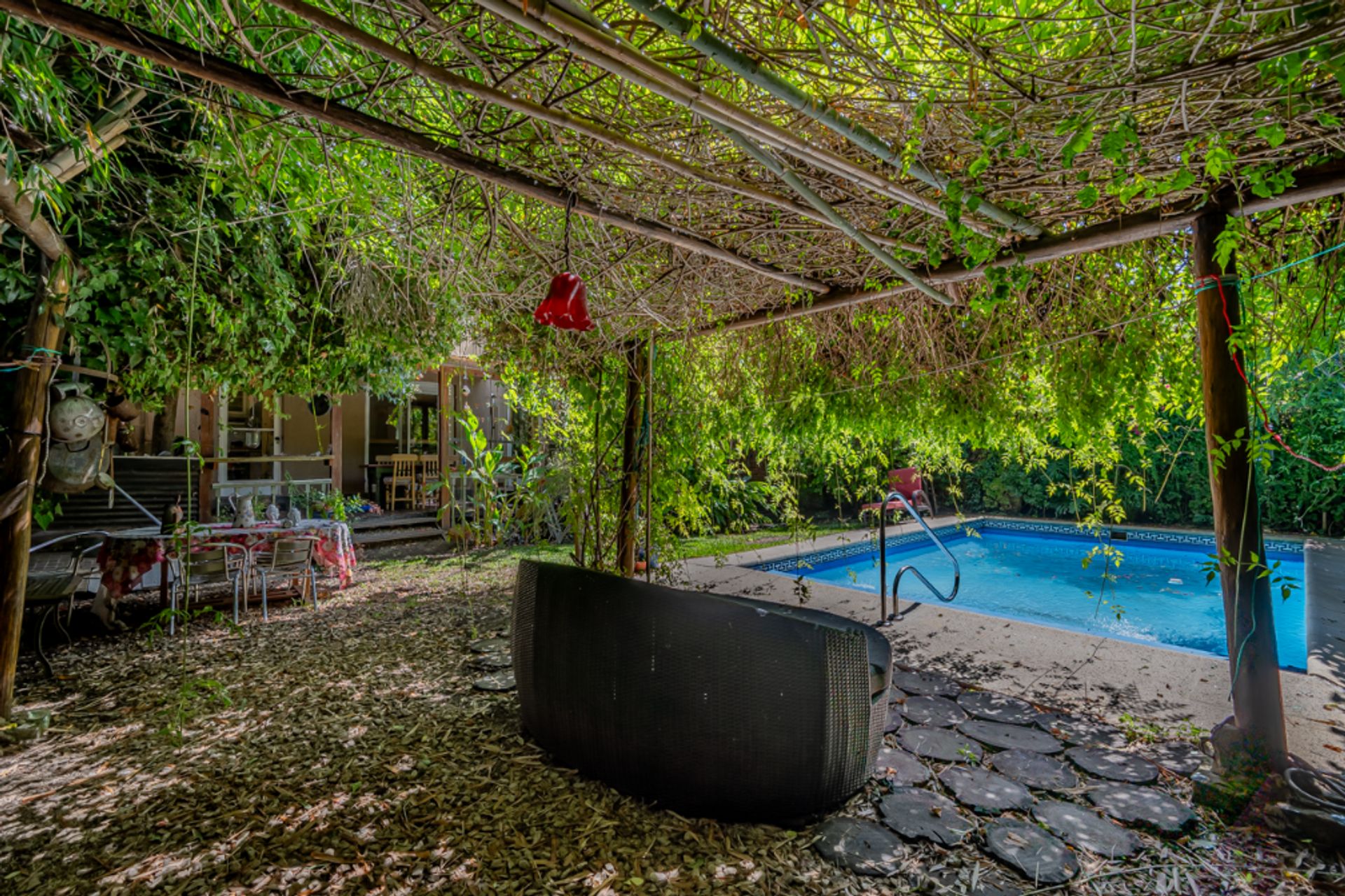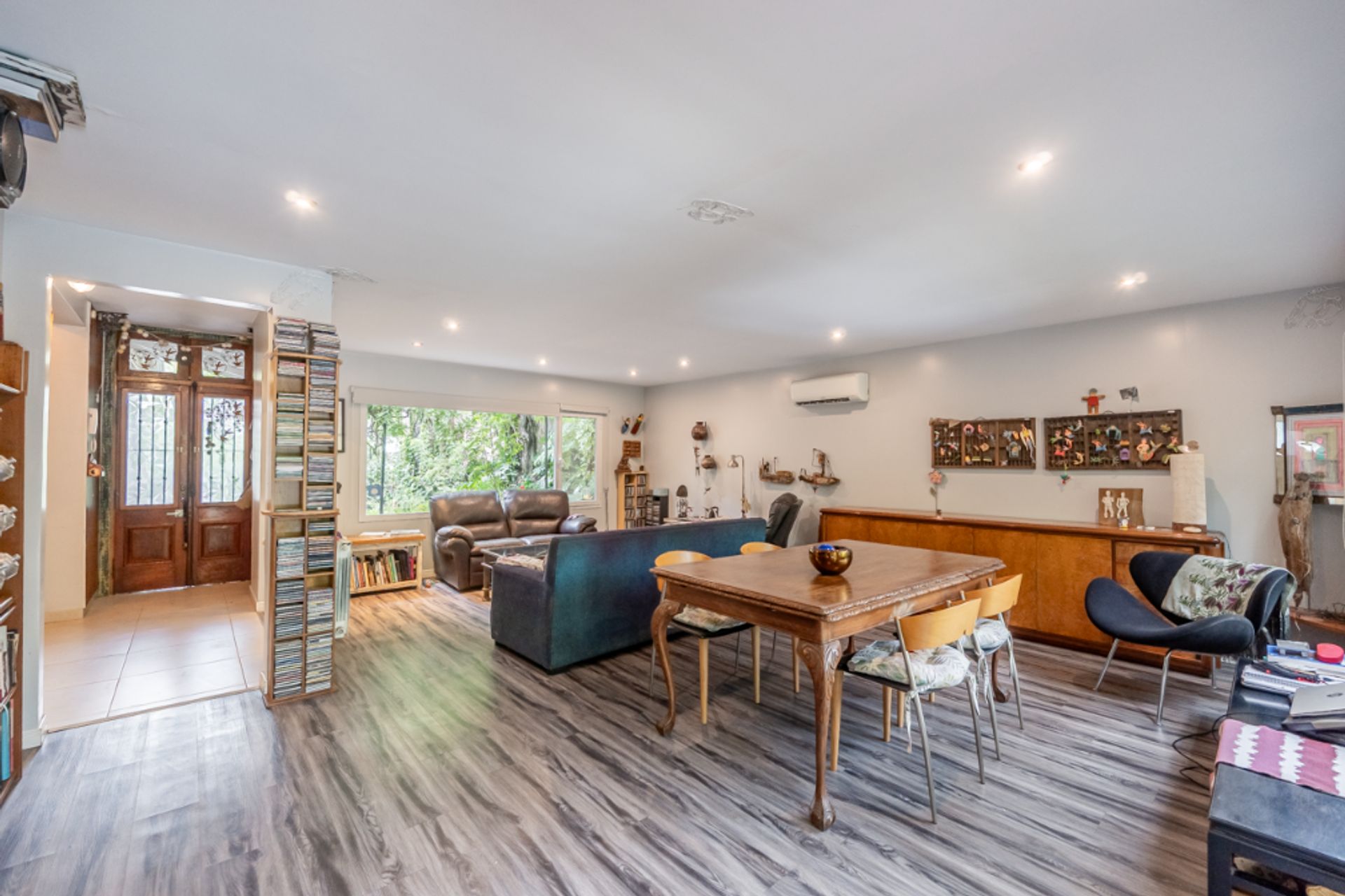 The house rises above the ground, ensuring dry rooms, cross ventilation and immersive views of the garden. The living‑dining area, measuring 6.90 by 5.80 meters, has an original arcade and is currently equipped with custom furniture, allowing immediate integration with the kitchen and creating a modern open‑concept space. The kitchen‑breakfast area includes an industrial kitchen and a dishwasher connection, and is complemented by a separate laundry room measuring 2.96 by 2.40 meters, with a washing machine connection.