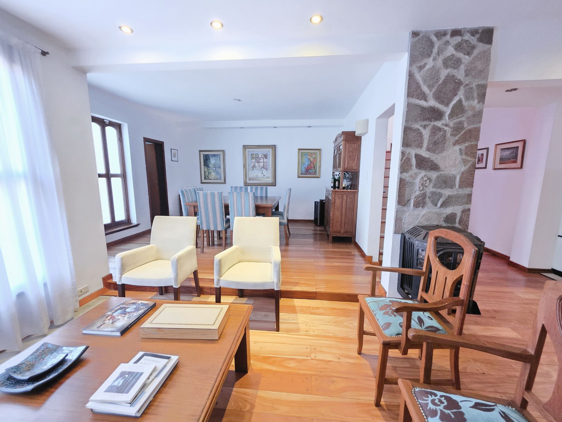On the ground floor, the entrance opens to a well‑maintained garden and a corridor featuring an iron pergola that leads to the living room and dining room, both fitted with parquet flooring and sealed gas fireplaces.