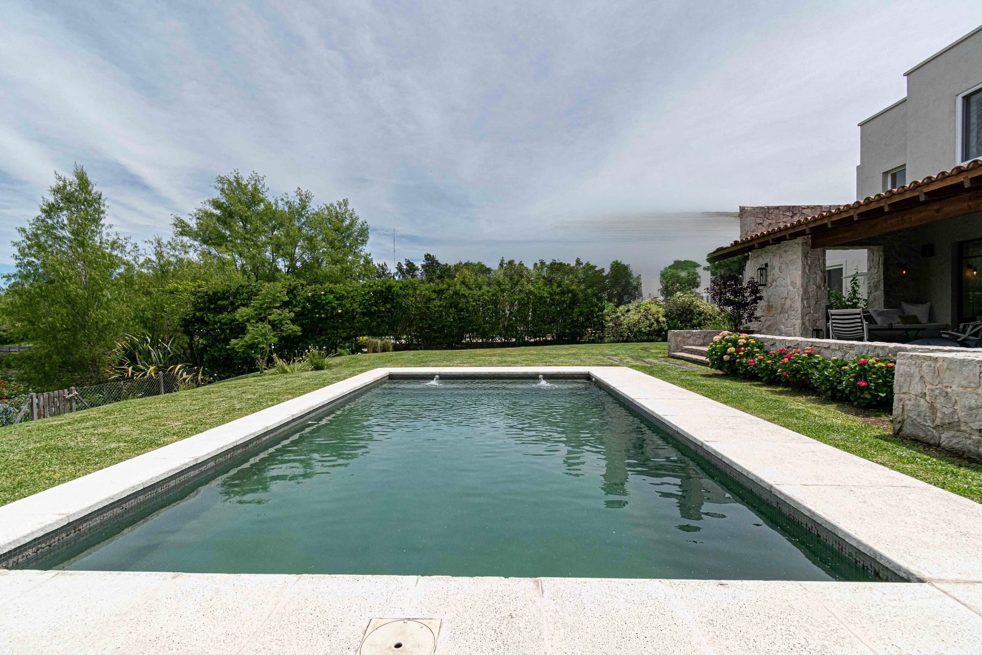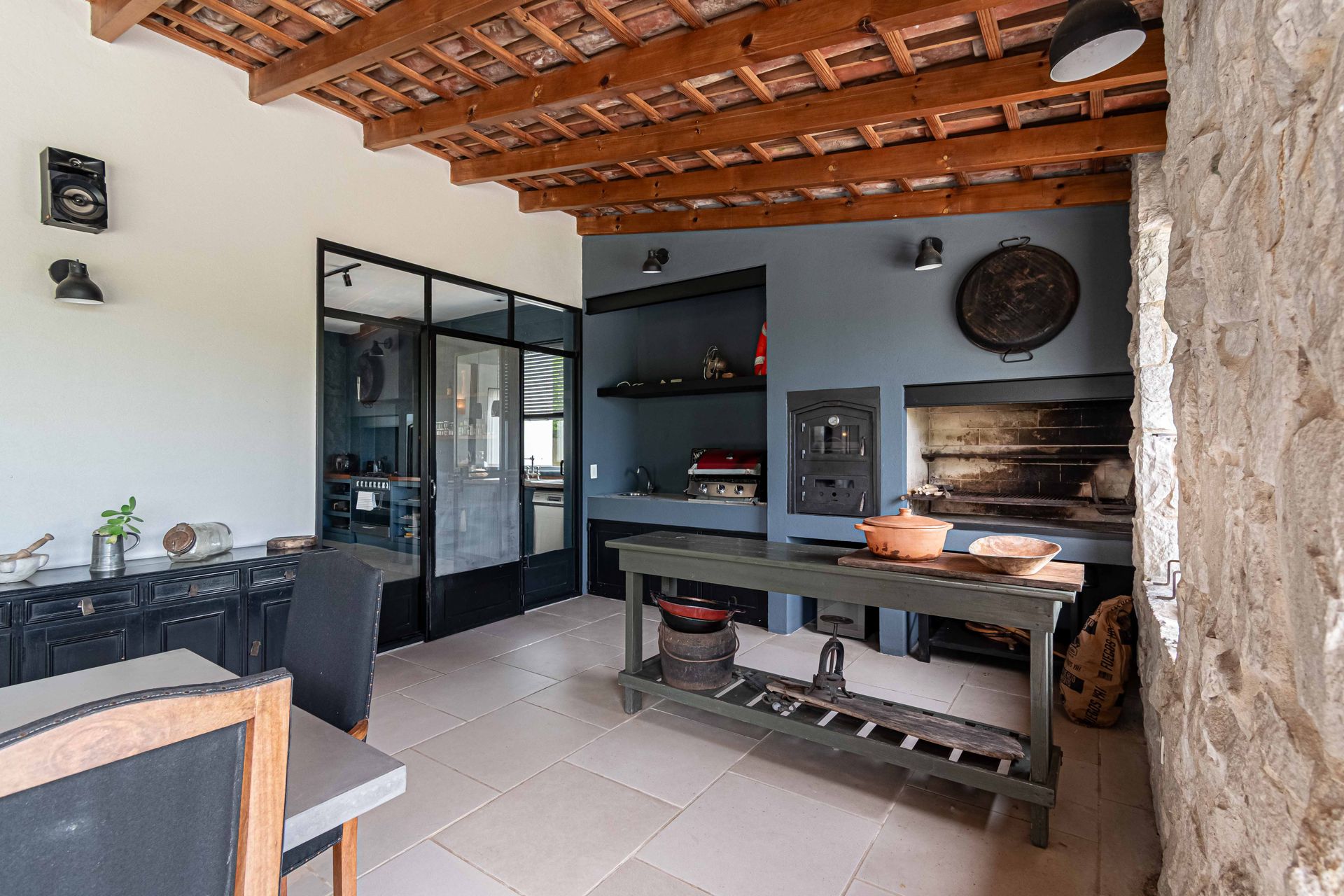 The exterior features a large gallery equipped with a grill and Tromen wood‑fired oven, a relaxation area with armchair and table, and a reinforced concrete pool with Venetian tile cladding. The area includes a fireplace, automatic irrigation in the garden, and a poolside bathroom, creating an outdoor oasis of relaxation.