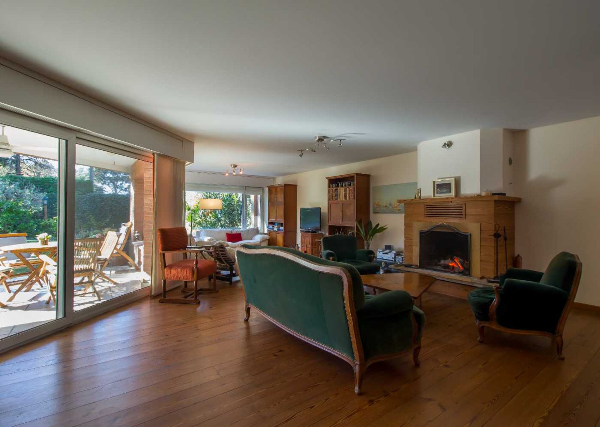 The ground floor features a reception hall that leads to an imposing central staircase made of solid pinotea timber, visible from all angles of the living area. The living‑dining space, finished with pinotea flooring and equipped with a wood‑burning stove, opens onto large windows offering park views. The kitchen, with a casual dining area and a large window overlooking the garden, includes a utility room and triple access from the living‑dining area, the garden, the gallery, and the service area, ensuring smooth circulation and comfort. In addition, the floor includes a service suite, a desk, and a toilet. The park provides a swimming pool, a lounge gallery, a barbecue, changing rooms, and a storage room, enhancing privacy and outdoor enjoyment.