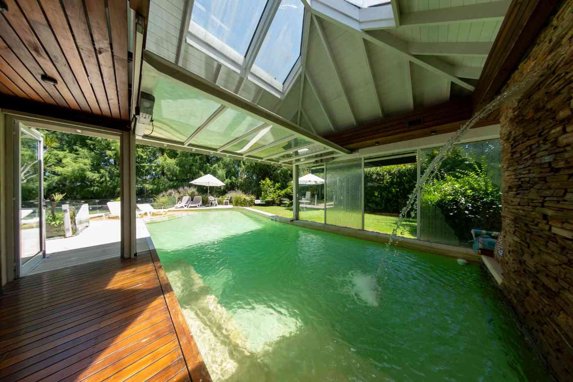 The spa and pool area includes a climate‑controlled indoor pool for winter and an outdoor pool for summer, locker rooms, a bathroom, a shower, a dry sauna for three people, a wet sauna for two, and a whirlpool for two. All within a tranquil and comfortable setting.