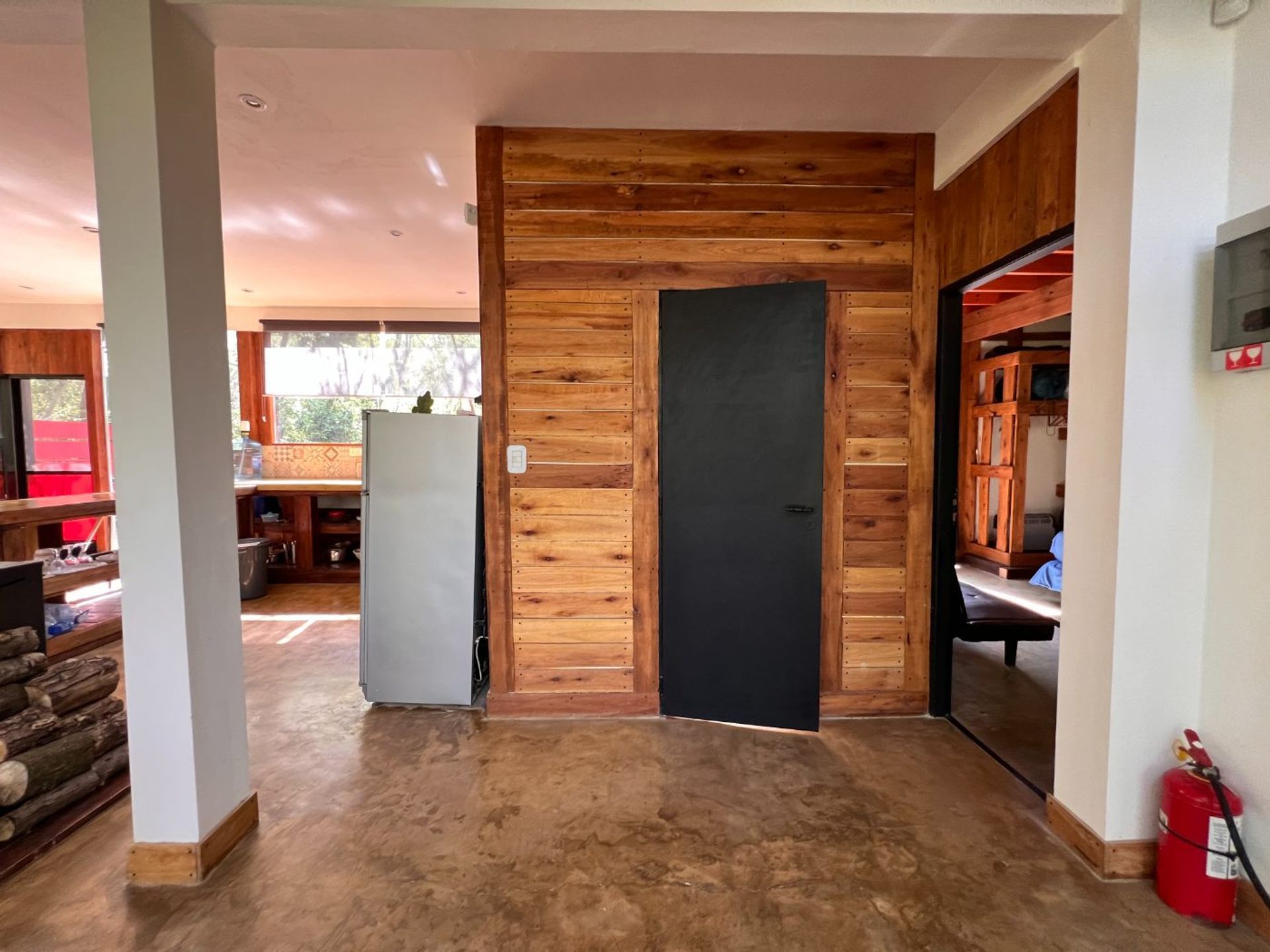 The second building is a 40 m² cabin developed over two levels with a quebracho foundation and machimbre walls, insulated with fiberglass and a wood‑framing structure. It features a living‑dining area with an integrated kitchen, a bathroom, and an open bedroom on the first floor, offering a rustic and welcoming atmosphere.