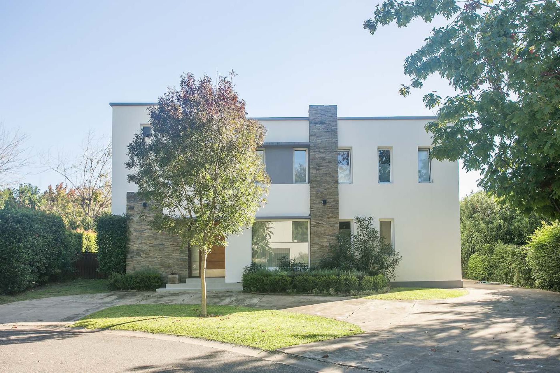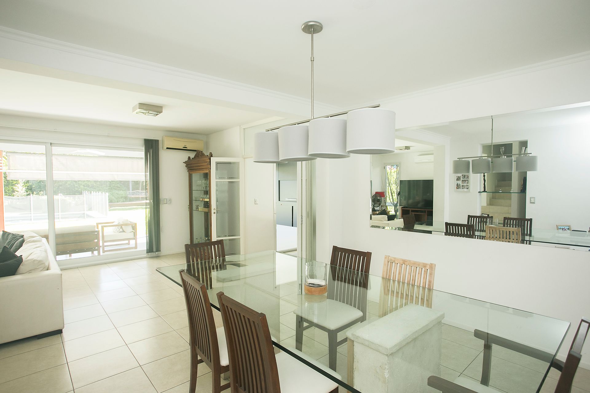 The property, spread over two levels, boasts high‑quality construction and premium finishes. The ground floor opens to a spacious living area with large windows that provide panoramic views of the gallery and garden. The dining area, designed for a six‑person table, integrates with a modern kitchen featuring an island, Silestone countertops, and wood paneling. The kitchen includes a separate oven and hob, and ample storage space. A reception toilet, a separate laundry room, and a servant’s quarters with bathroom complete the level. Adjacent, a versatile patio (quincho) offers a grill with a black aluminum lid, a pool with a counter, a gas stove, and a fold‑out glass enclosure to enjoy it year‑round. The gallery, equipped with awnings and screens, opens onto a spacious courtyard and a pool with an island.