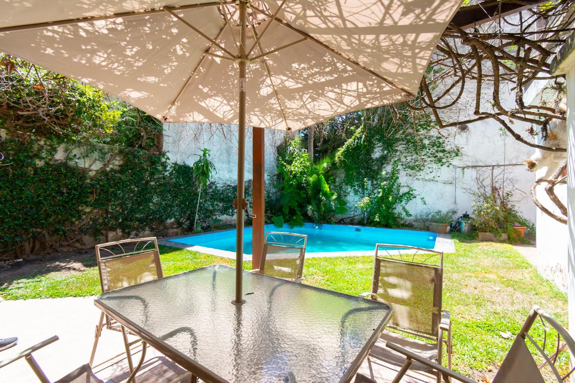 Garden with a tiled pool. Grill with countertop.