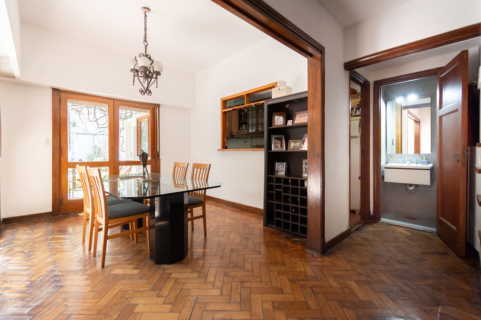 Entry hall. To the right of the hall is the dining room that opens onto the garden and the living room that faces front, with a fireplace and Slavonian oak parquet floors. Double windows. The kitchen has wooden furniture and connects to the garden. At the back there is a small storage room with a service bathroom. Reception toilet. On the other side of the entry hall, to the left, there is a spacious area like a playroom or quincho with a slatted roof and exit to the garden.