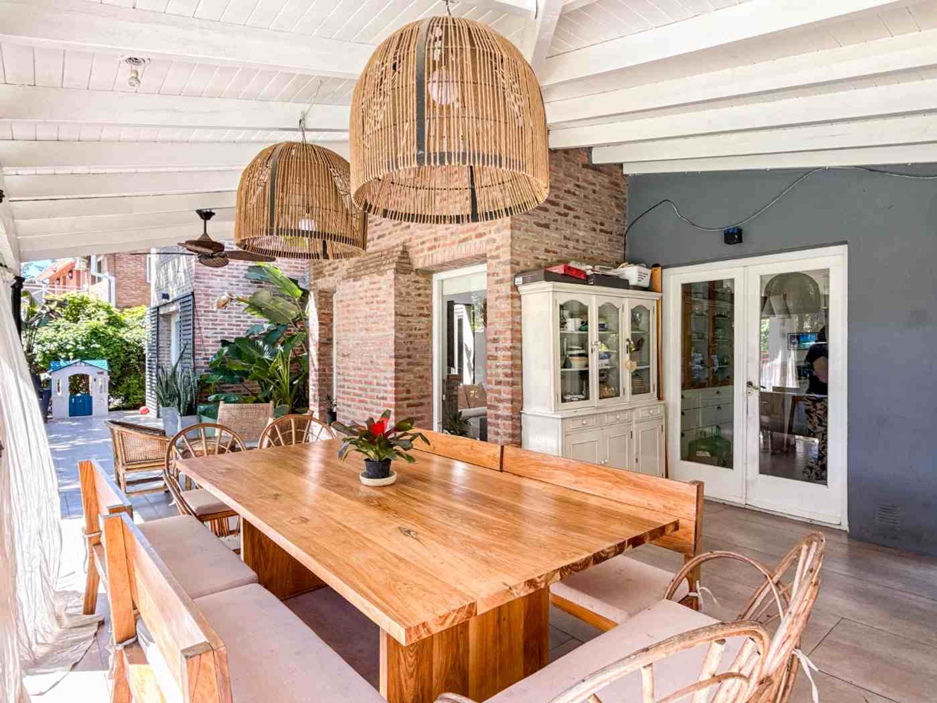 From the kitchen, a gallery leads to the grill area and clay oven, overlooking the garden and the pool in excellent condition. The expansive outdoor patio includes a living area and a meeting zone ideal for outdoor events.
