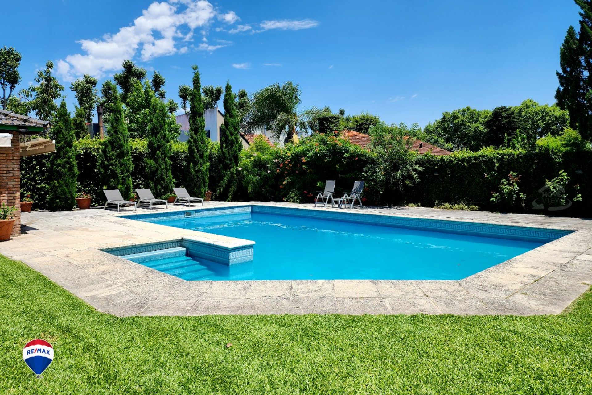 The exterior features a garden with sprinkler irrigation, a sizeable pool with filter, a fully covered patio and a semi‑covered patio with grill. Inside the patio there is a fireplace, a kitchen, a water heater, and a bathroom, creating a perfect space for outdoor gatherings. The front of the house provides an uncovered area for several cars, complemented by exterior security cameras.