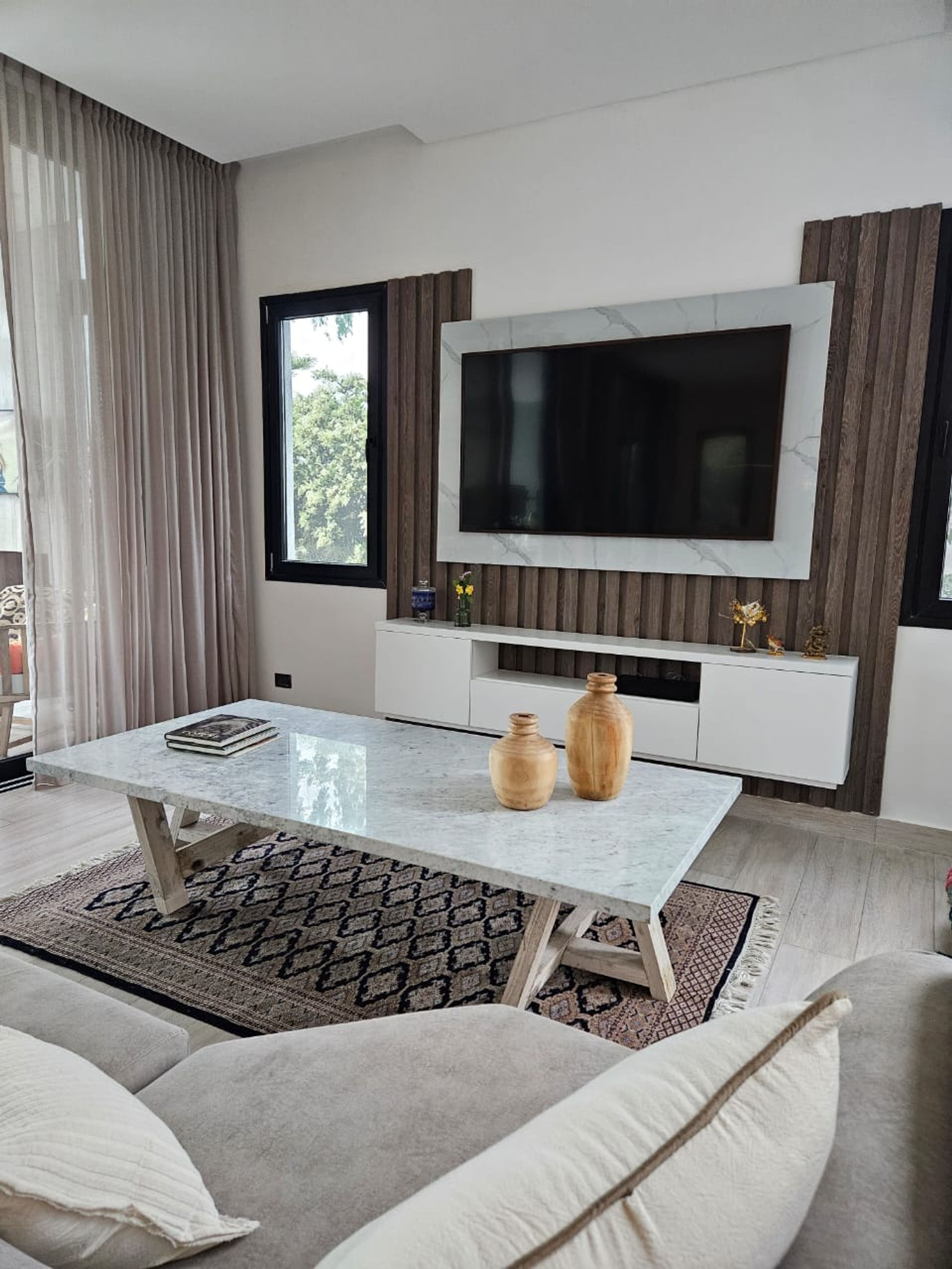 - Enclosed gallery with fireplace, glass and iron openings, equipped with grill, pizza oven, sink and additional island, ample storage space, air conditioning, and TV connection.