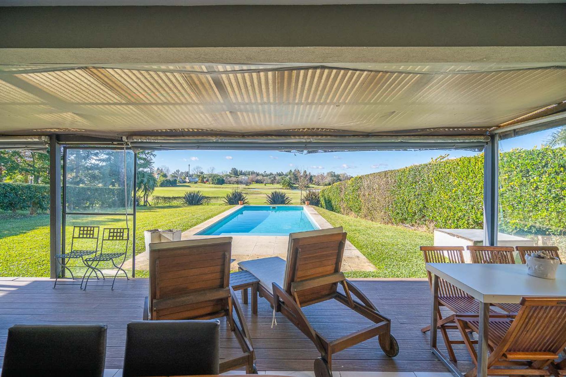 This two‑storey house, with five rooms and a separate unit, opens onto a spacious 44 m² gallery equipped with a grill and pool, offering panoramic views of the golf course from every corner.