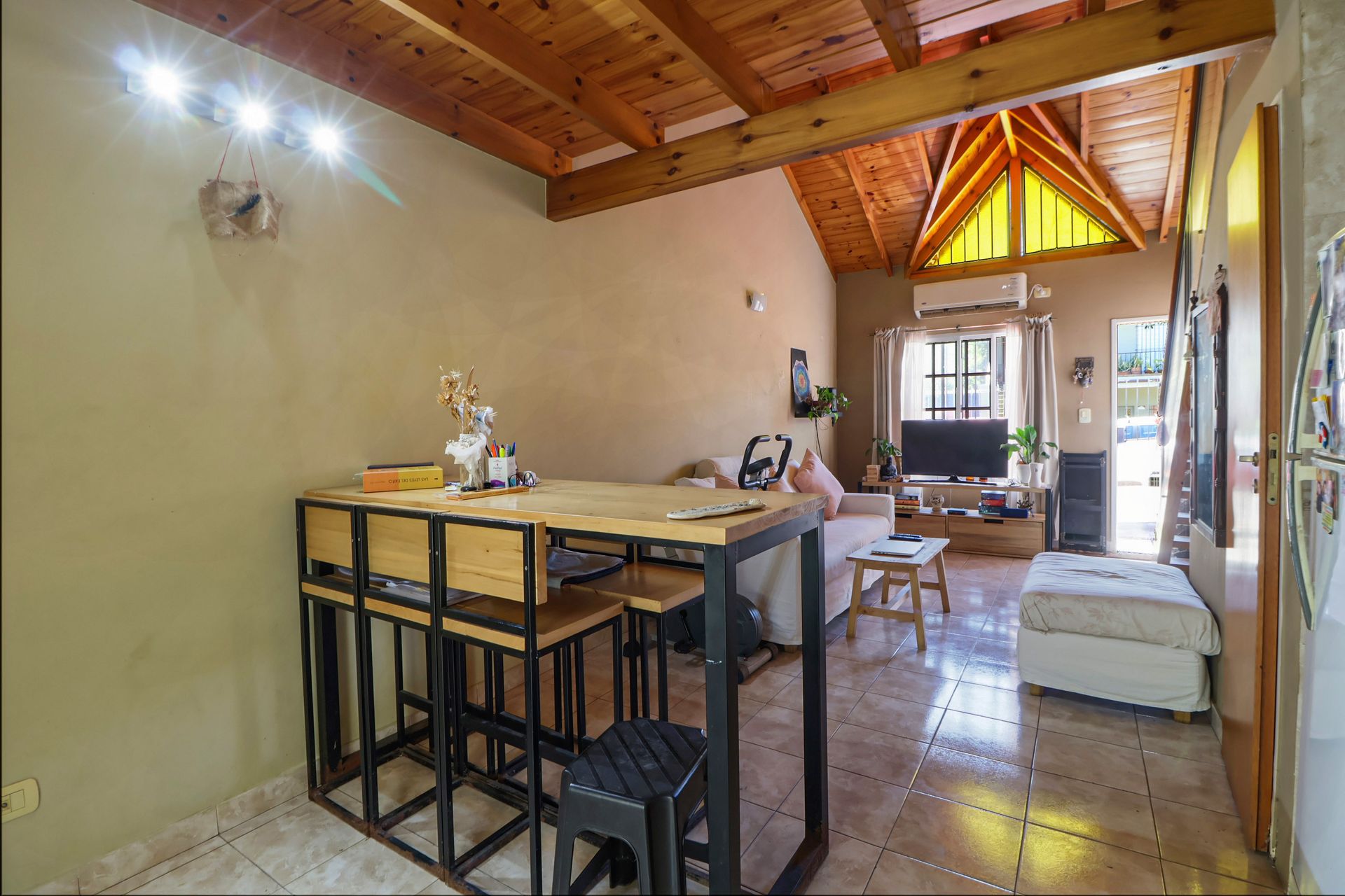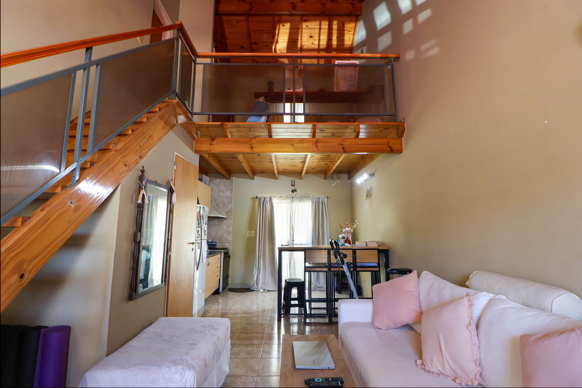 The main unit, positioned between the two previous ones, offers a separate entrance with a large front garden and access to a covered patio with grill and integrated laundry area. The dining‑kitchen area is spacious, bright, and well‑ventilated. The primary bedroom is generously sized, while the second bedroom on the mezzanine can serve as an additional room or office space. The through vehicle entrance provides space for multiple cars.