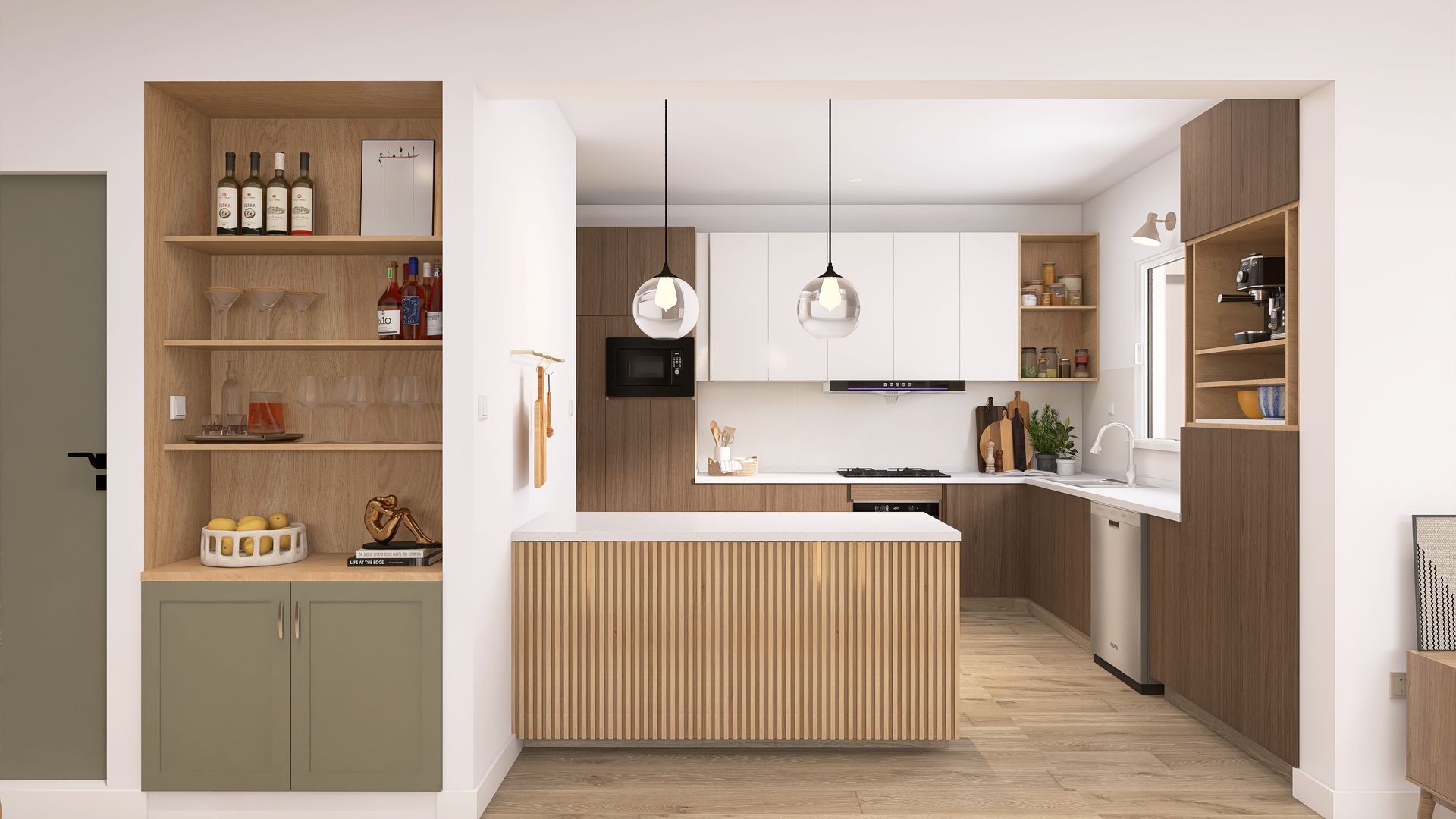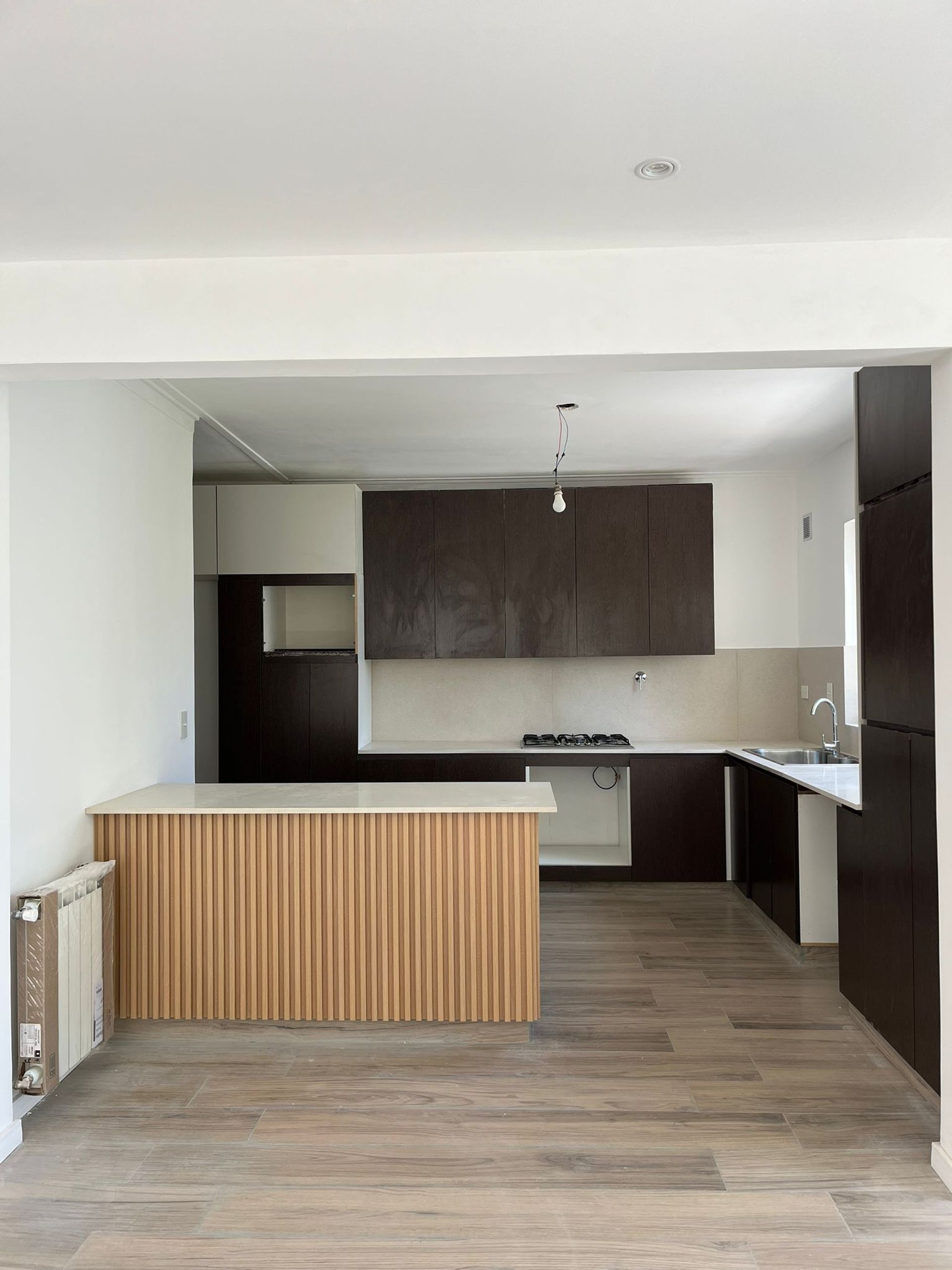 The spacious living‑dining area, integrated with the kitchen, is illuminated by abundant natural light. Porcelain tiles with a wood effect and white PVC windows with double‑wall insulation provide a modern, airy touch. The kitchen features high‑capacity melamine cabinetry, quartz countertops, gas hob and oven, and contemporary FV tapware. Final finishes are nearly complete, and the renders show the optimal layout of furnishings.