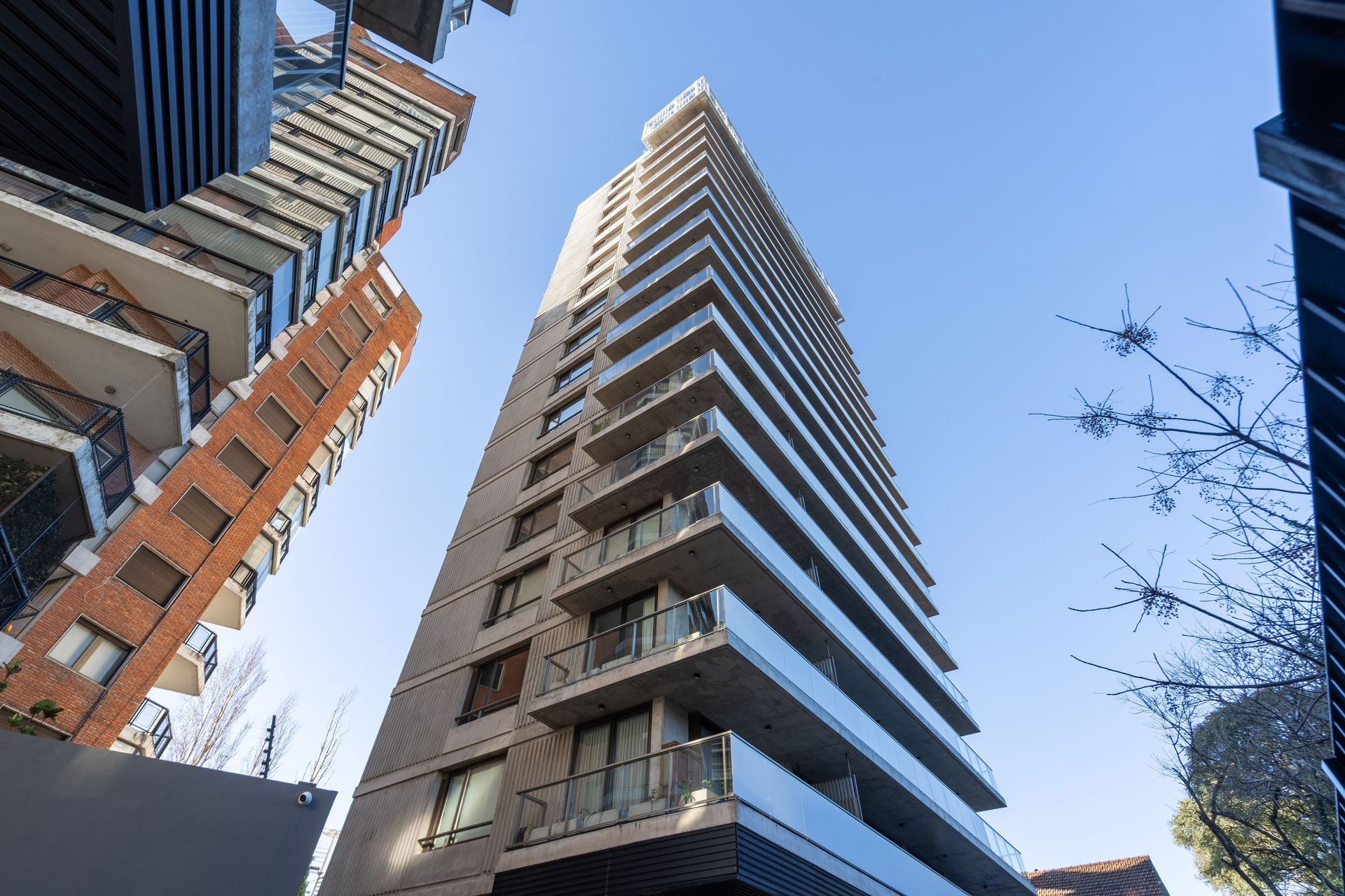 Access to the building is via an exclusive street leading to the residential lobby, with access control to covered parking and a security ramp. Entrance halls feature double height, aluminum joinery, polished granite floors, and high‑quality finishes, complemented by an art program in the circulation.