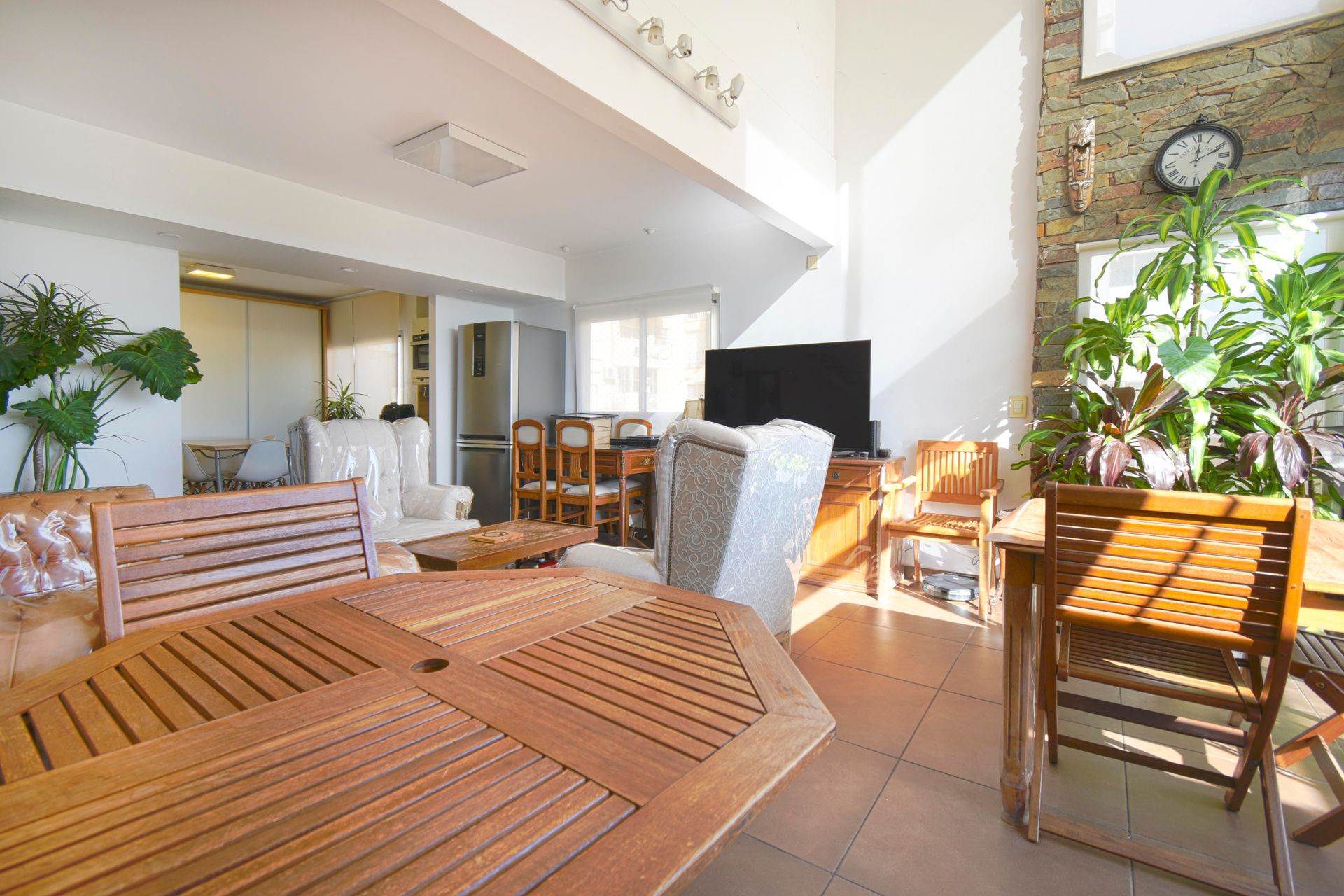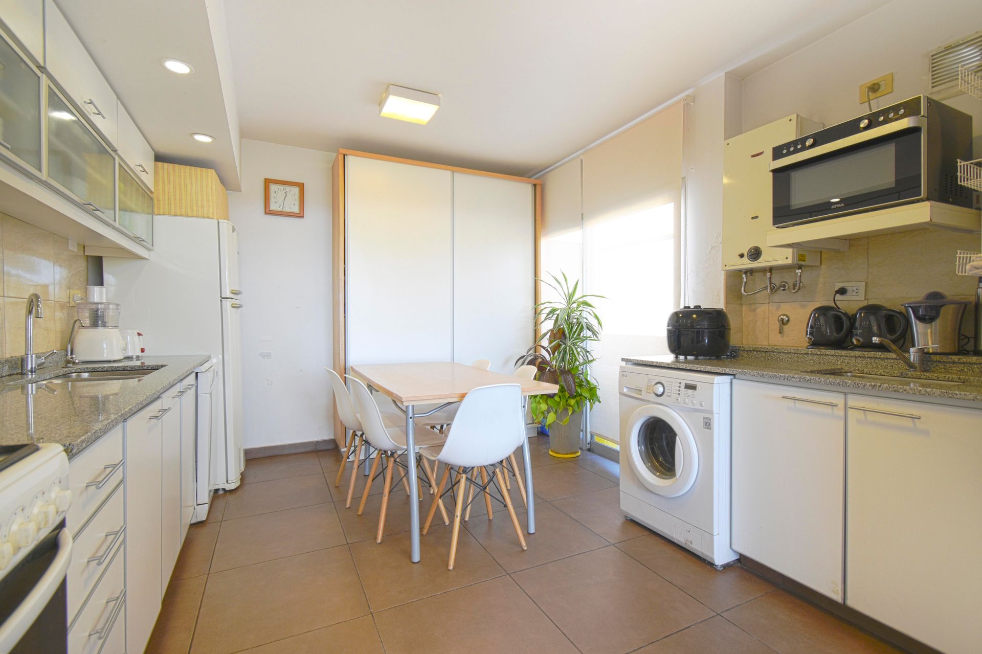 On the ground floor there is a full bathroom, a kitchen with base and tall cabinets, and a very wide countertop that incorporates an integrated laundry area. The space opens to a living-dining area with a double-height bay window and a side balcony. A west-facing balcony, oriented toward the sun, is ideal for growing plants all day long.