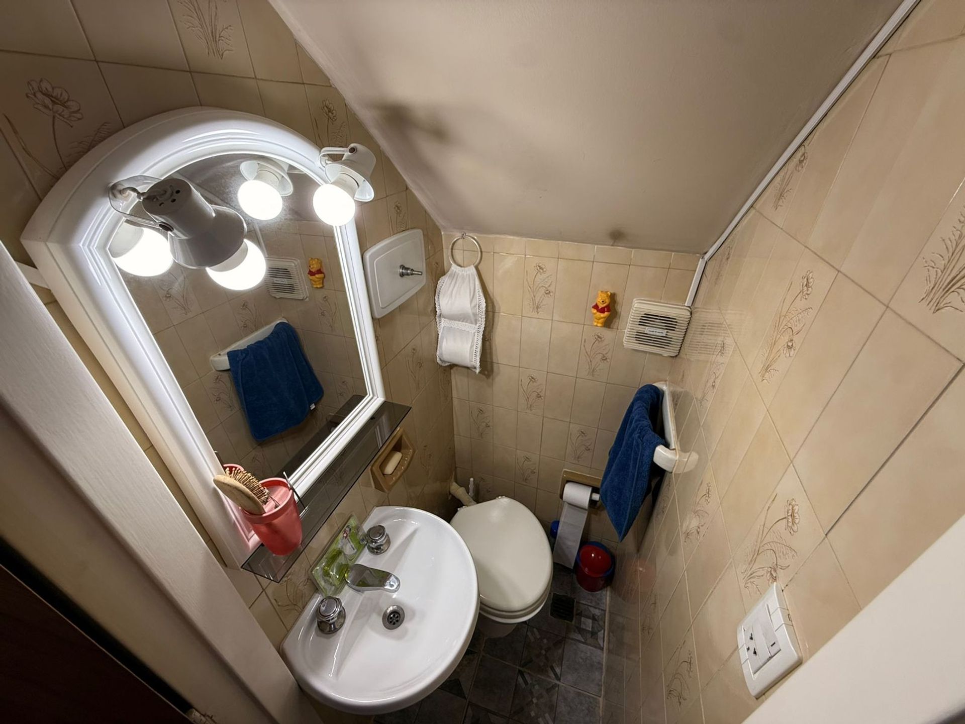 The upper floor houses three bedrooms, two of generous size, all fitted with wardrobes and parquet flooring. A full bathroom completes the layout.