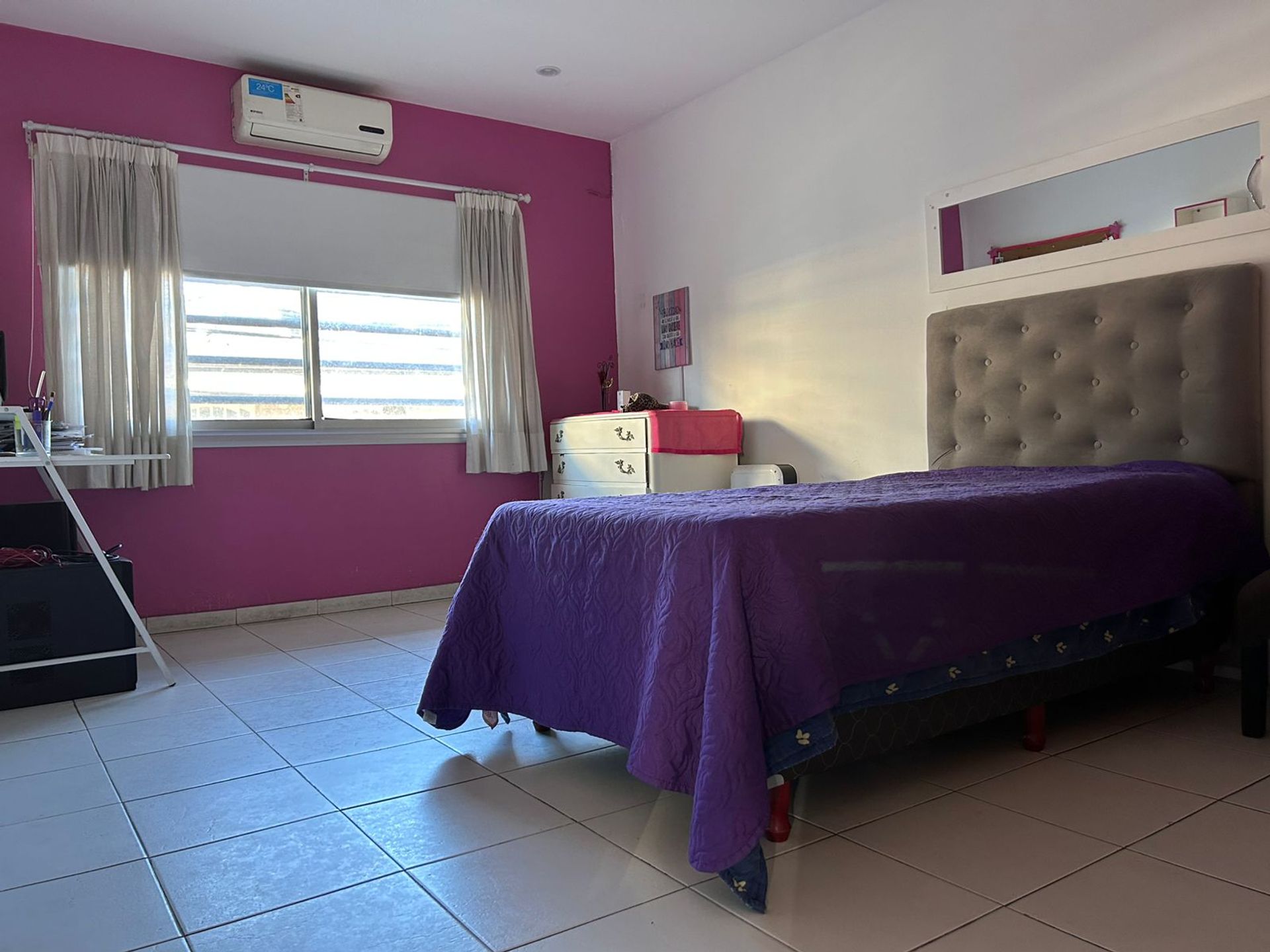 From the living room, a staircase leads to a spacious playroom, a versatile space that can be adapted as a playroom, office or additional bedroom. At the same level is a third bedroom, also with air conditioning and access to a private balcony overlooking the patio, offering a private refuge within the house.