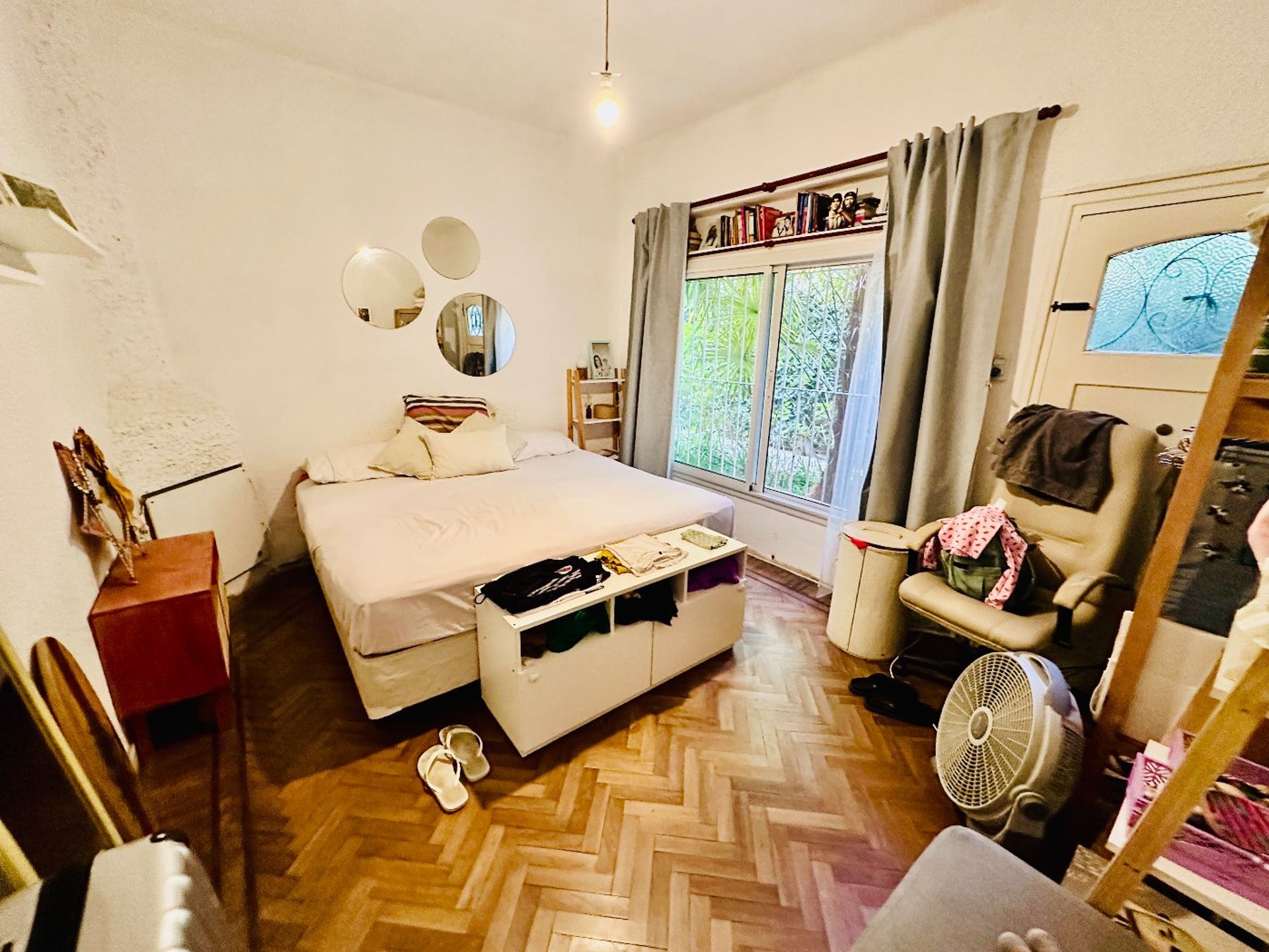 The residence is single‑storey and is accessed through a hallway that leads to a spacious living‑dining area with parquet flooring in pristine condition, offering a bright and welcoming atmosphere. The full bathroom includes a bathtub and a window overlooking the patio, ensuring privacy and natural ventilation.