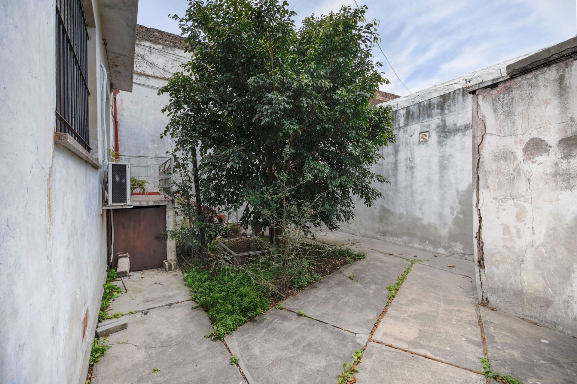 The ground floor offers a practical layout with two bedrooms, a full bathroom, an integrated kitchen-dining area, and a desk/storage space. A wide back patio, along with a laundry area and a shed inviting customization, complement the surroundings.