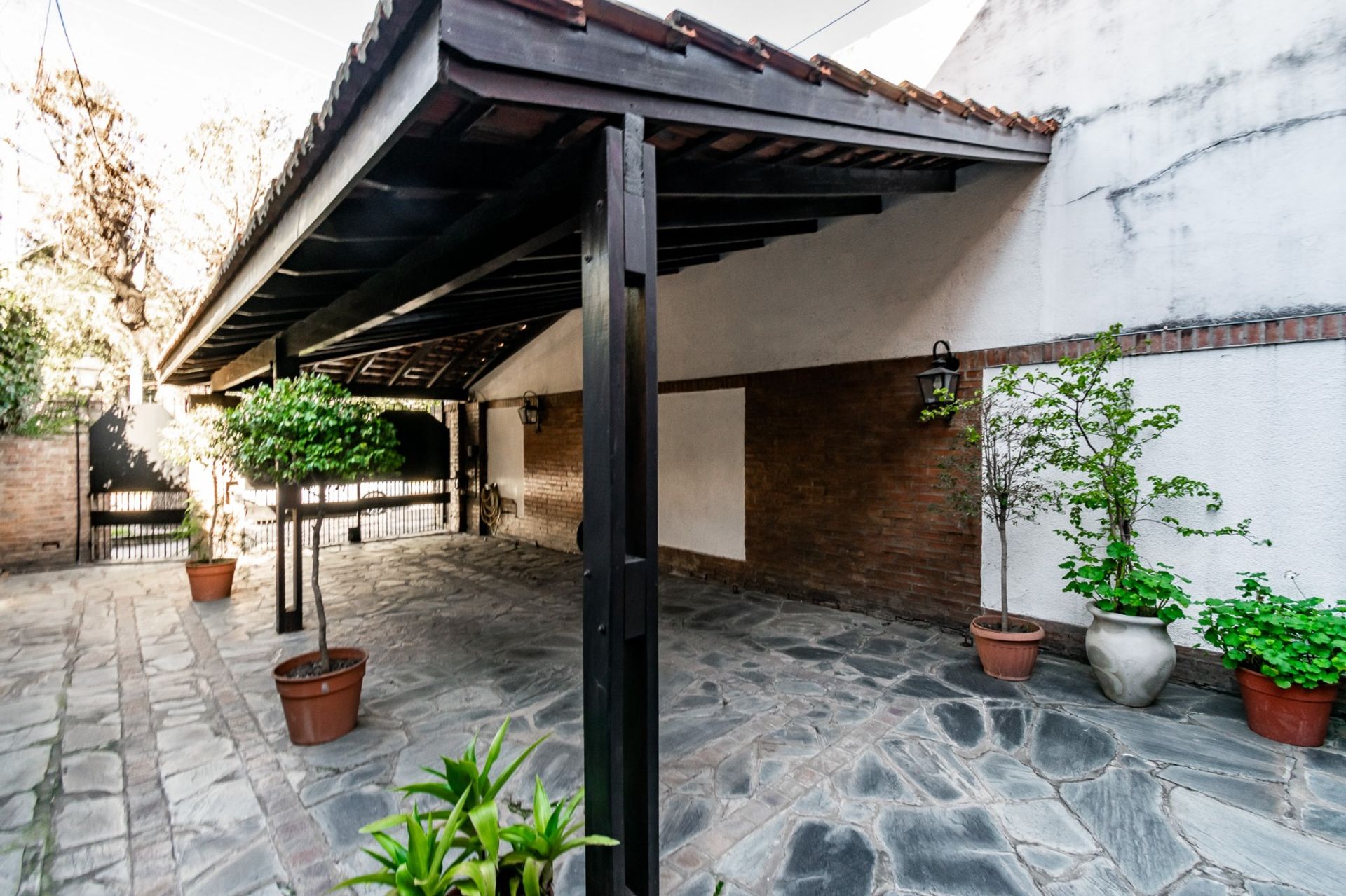 The front of the property provides covered space for at least one vehicle, with a metal gate that offers privacy and security. Fencing at the openings and the front enclosure reinforce protection for the home.
