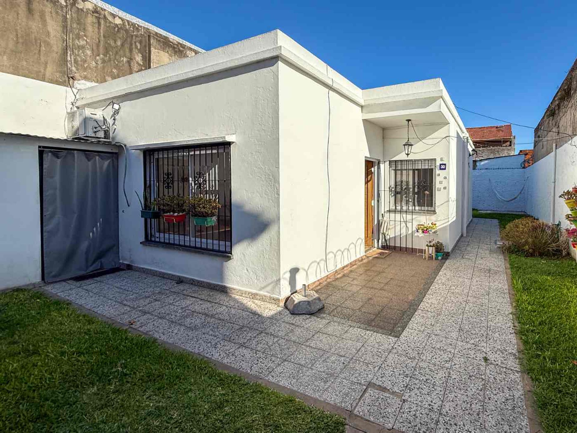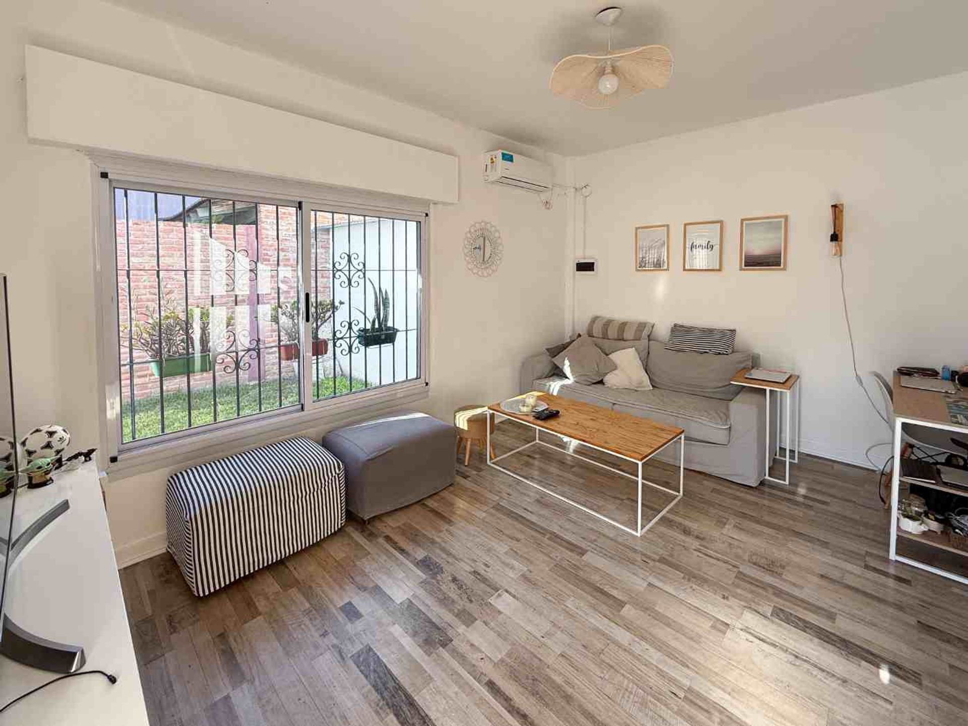 The interior layout is organized through a hallway that connects the different rooms. The two bedrooms, of good size, have closets and natural ventilation, and are finished with parquet floors in very good condition, adding warmth and elegance to the spaces. The full bathroom includes a bathtub, and the independent kitchen is equipped with under‑counter cabinets and ample storage space, maintaining a visual connection with the exterior.