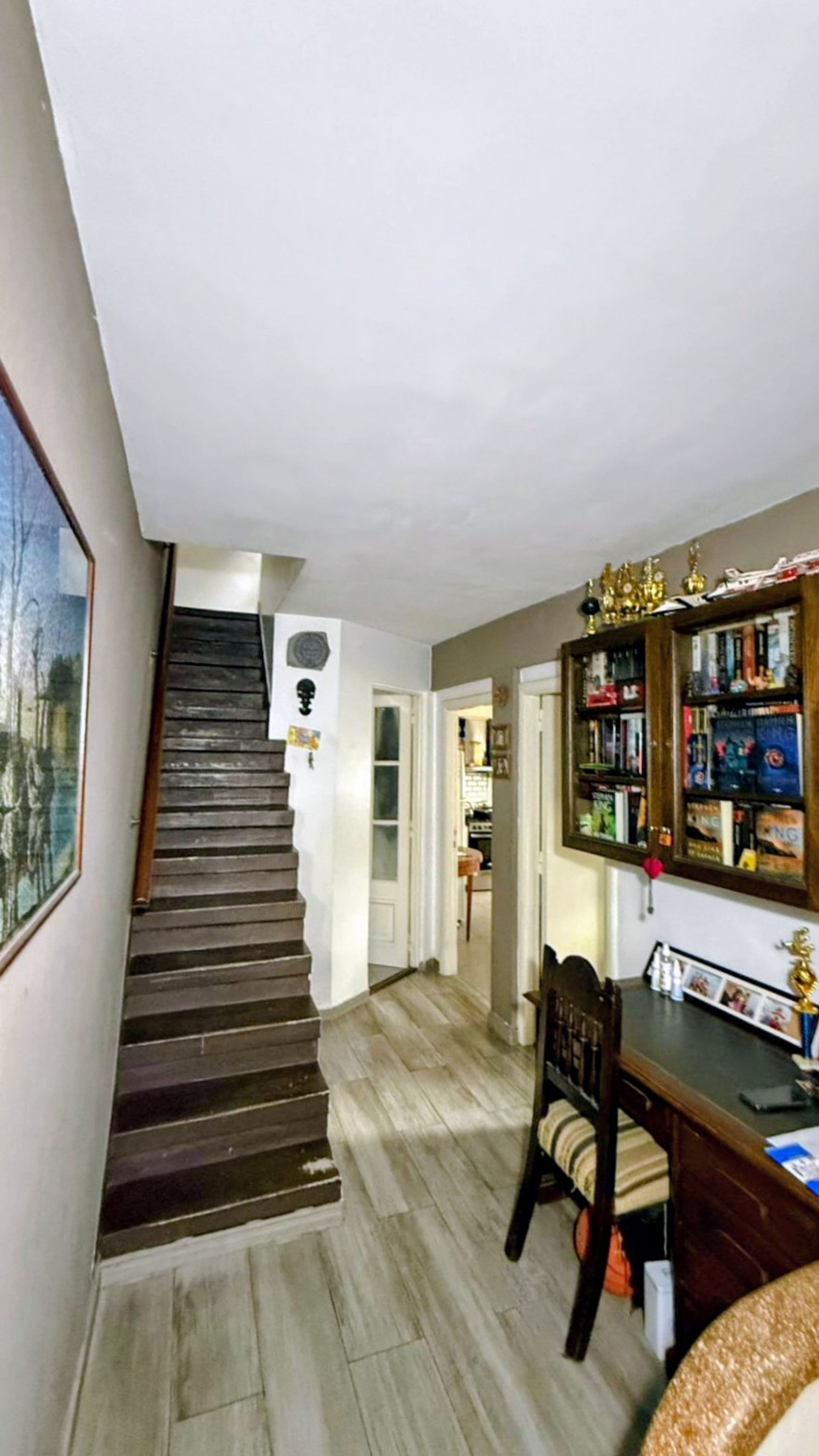 Entrance hall with space for a desk and storage area under the staircase. Daily dining area with integrated kitchen, large bay window that allows natural light and heating/cooling air conditioning. Master bedroom with front bay window, heating/cooling air conditioning, and large walk‑in closet. Full bathroom with exterior ventilation.
