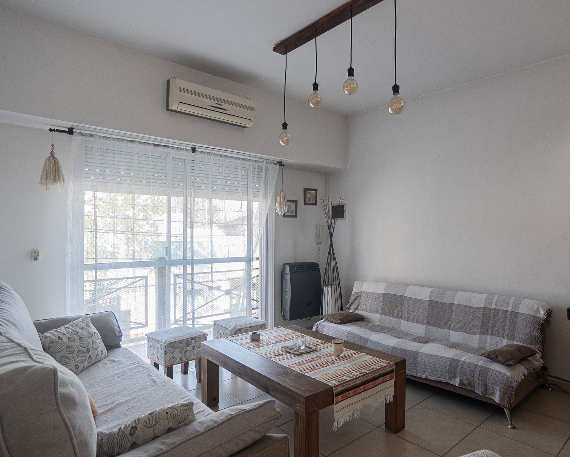The first level presents a spacious living area with balcony, a fully equipped kitchen with modern appliances, a full bathroom, and a terrace with a covered patio and grill, ideal for enjoying outdoor gatherings.