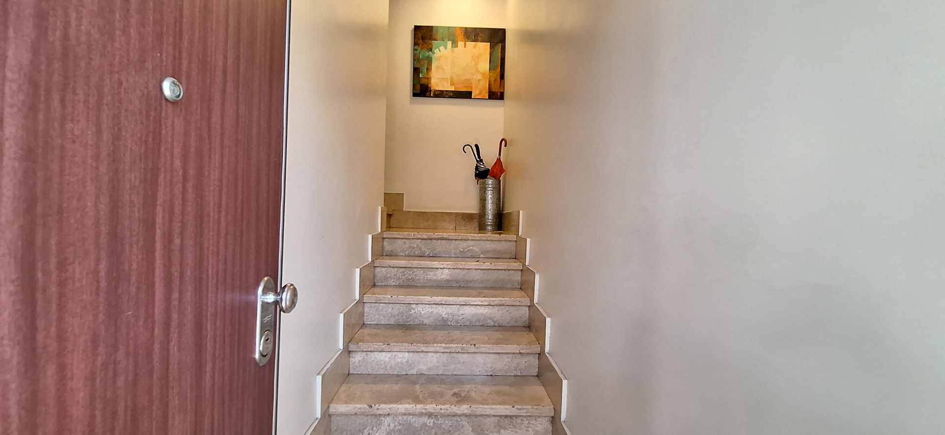 This elegant four‑room apartment is located on the first floor, with a private entrance that leads to a private staircase. Upon entry a spacious foyer opens, serving as the central axis for the layout of the spaces.