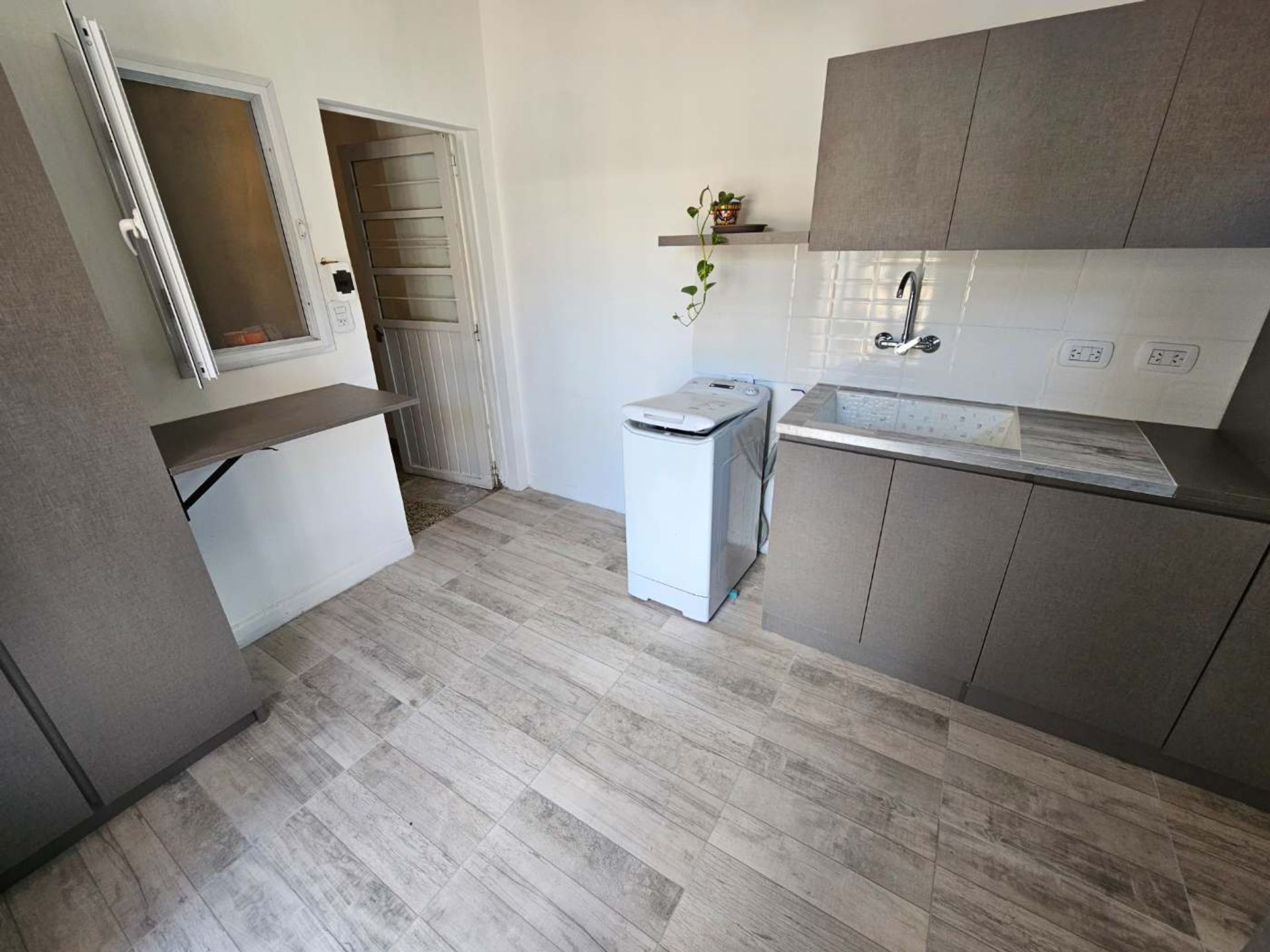 Entry opens to an uncovered garage and a wide hallway leading to the first level. On this level there is a bright living‑dining area that can be expanded to a third bedroom if desired. The kitchen, with industrial‑style lower cabinets and porcelain tiles with a wood‑look finish, integrates harmoniously into the space. Two spacious bedrooms guarantee privacy, and the full bathroom is equipped with modern finishes. A large separate laundry area, with a newly renovated small balcony, adds additional functionality.