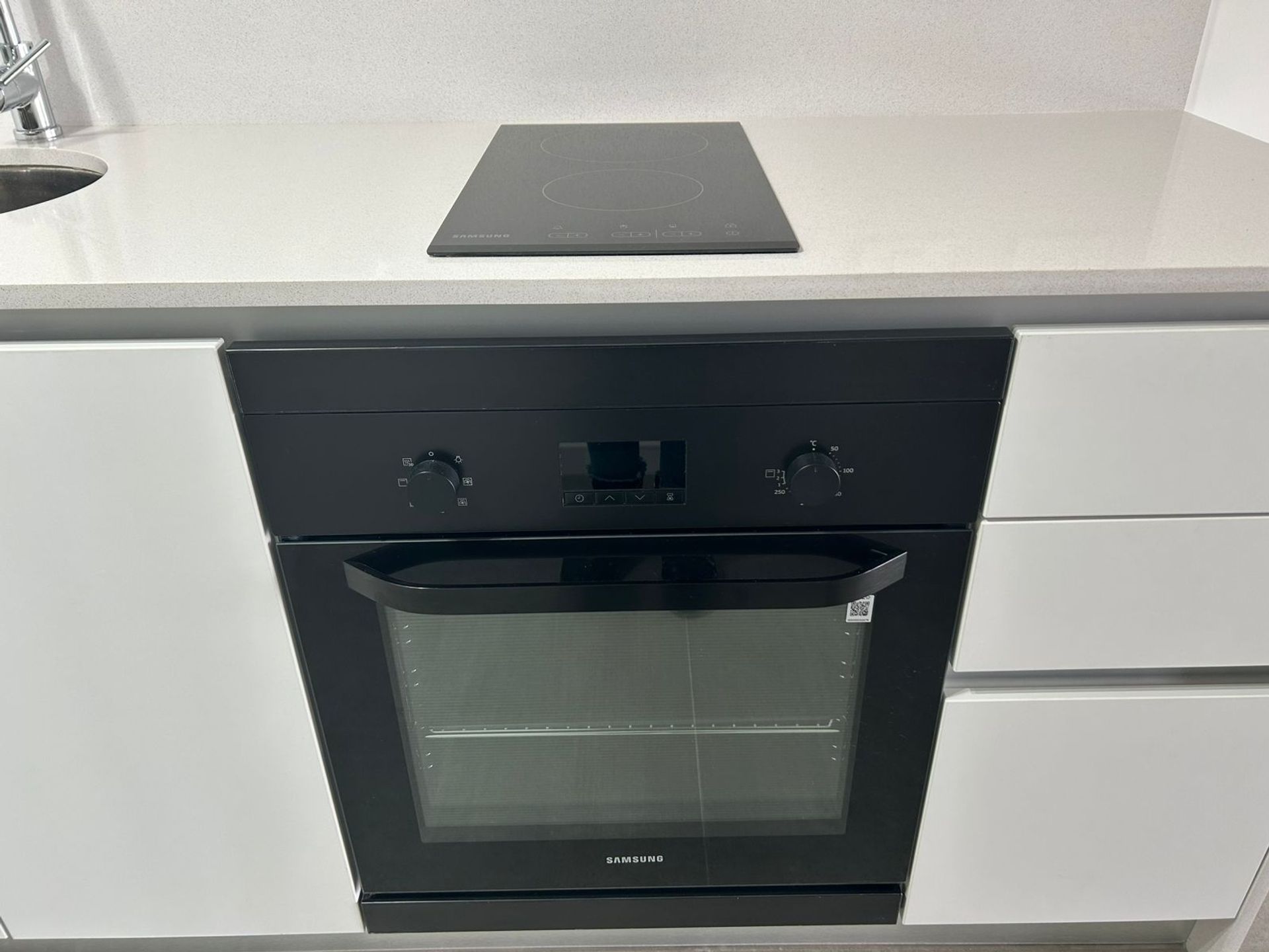 The interior features high‑quality finishes and aluminum double‑glazed windows. The kitchen, equipped with base cabinets and Samsung appliances (stove and electric oven), offers functionality and style. The full bathroom includes Roca fixtures and a built‑in shower screen, complemented by blackout curtains, a TV mount, and modern lighting, ensuring comfort and privacy.