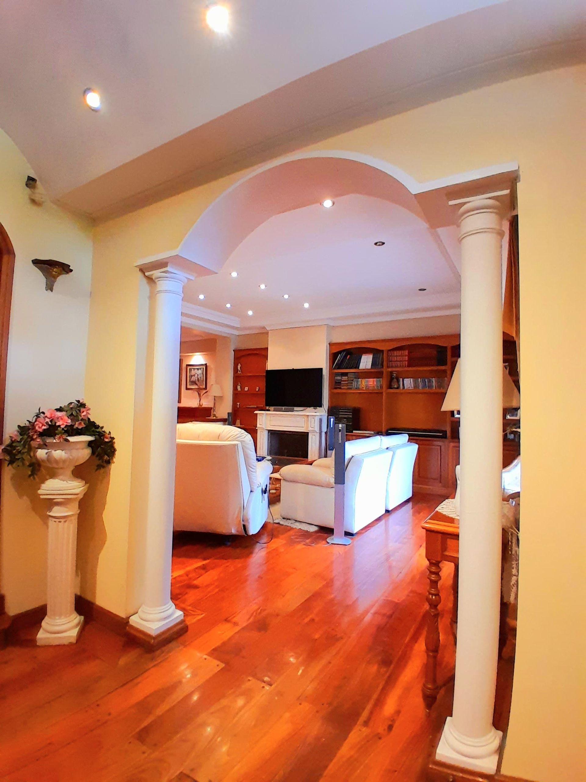 The basement houses a covered garage for three cars with automatic gate, a service wing with bathroom, laundry, pantry, machine room, and a spacious patio equipped with grill and oven. From there you access the landscaped garden that contains a 10 × 5 m pool surrounded by vegetation. The climate‑control system is central air conditioning with heating and cooling via ducts.