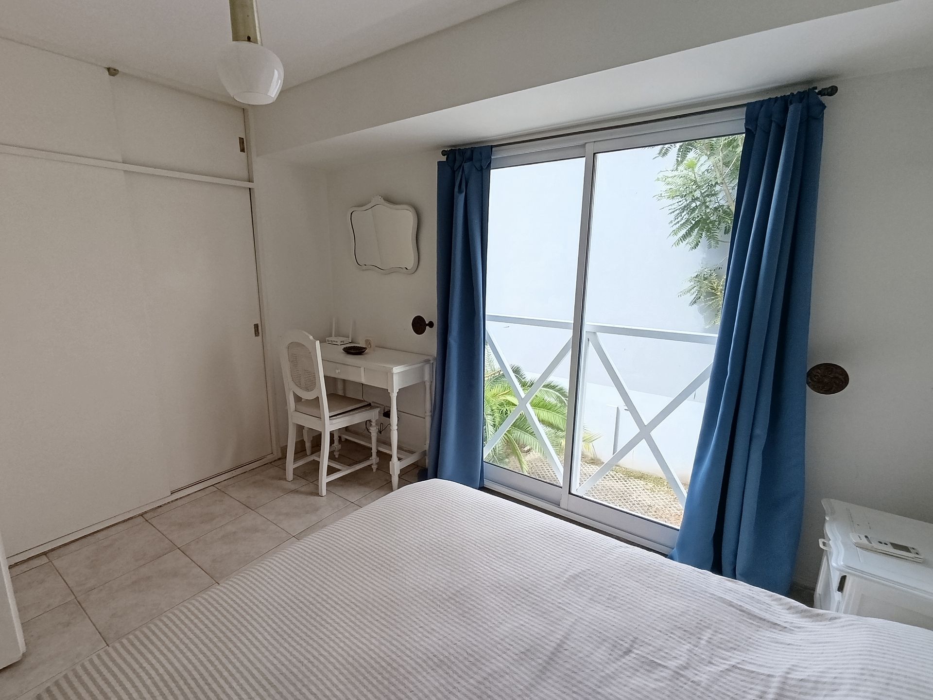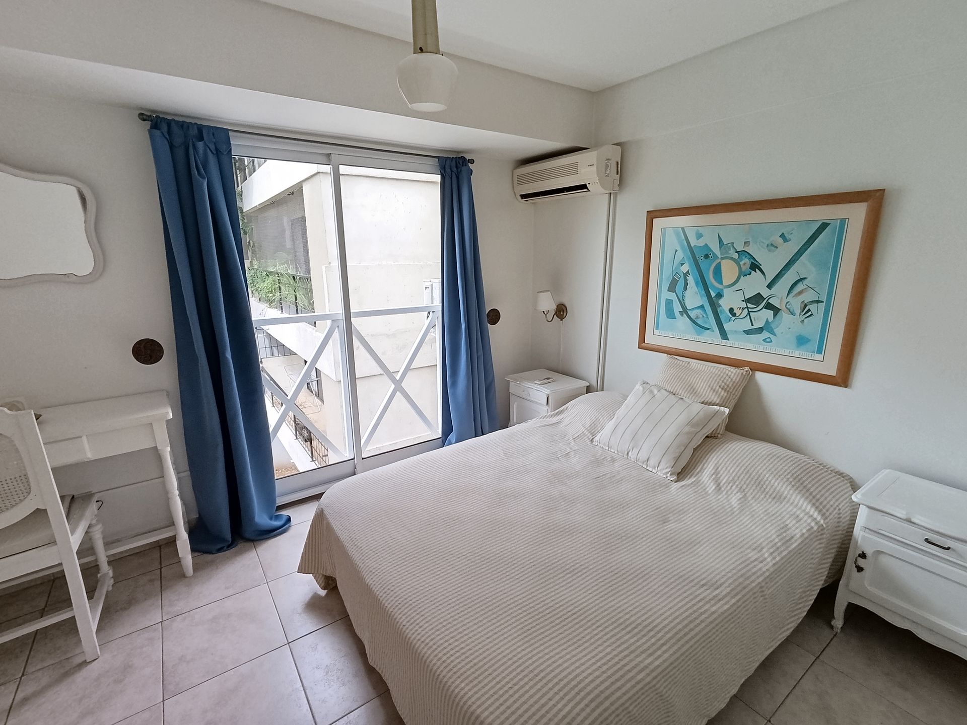 The bedroom is equipped with a double bed, air conditioning, bedside tables, wardrobe, and desk, providing an intimate and functional space for rest and work. The full bathroom is fitted with modern, functional finishes.
