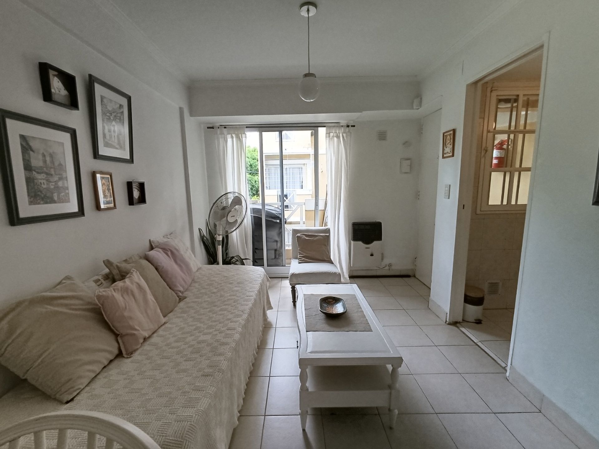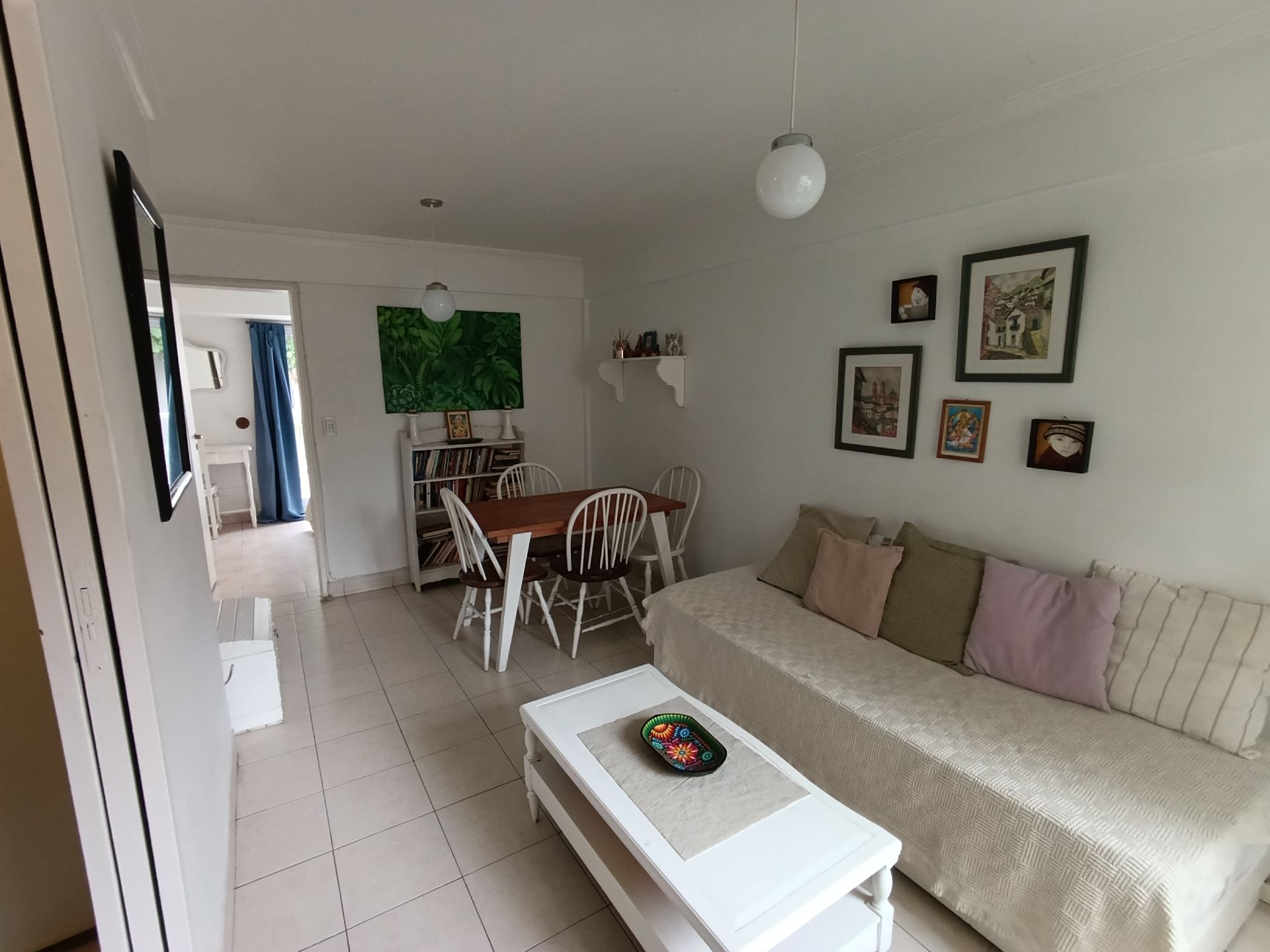 The living room and dining area open onto a private balcony, where natural light floods the space and is complemented by high‑quality ceramic flooring. The furnishings include a table, four chairs, a two‑person sofa/bed, and a side table, all arranged to create a welcoming and versatile atmosphere.