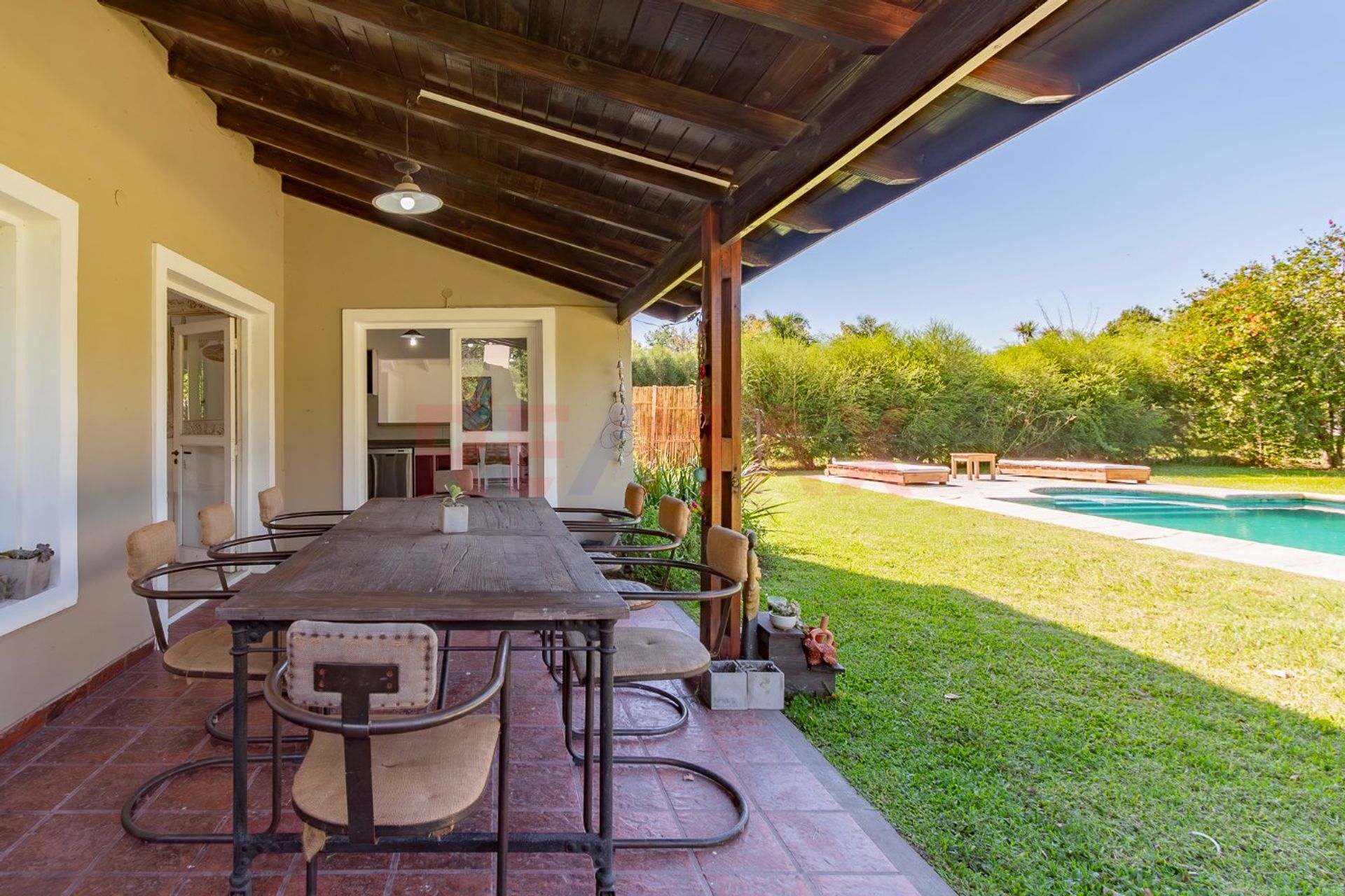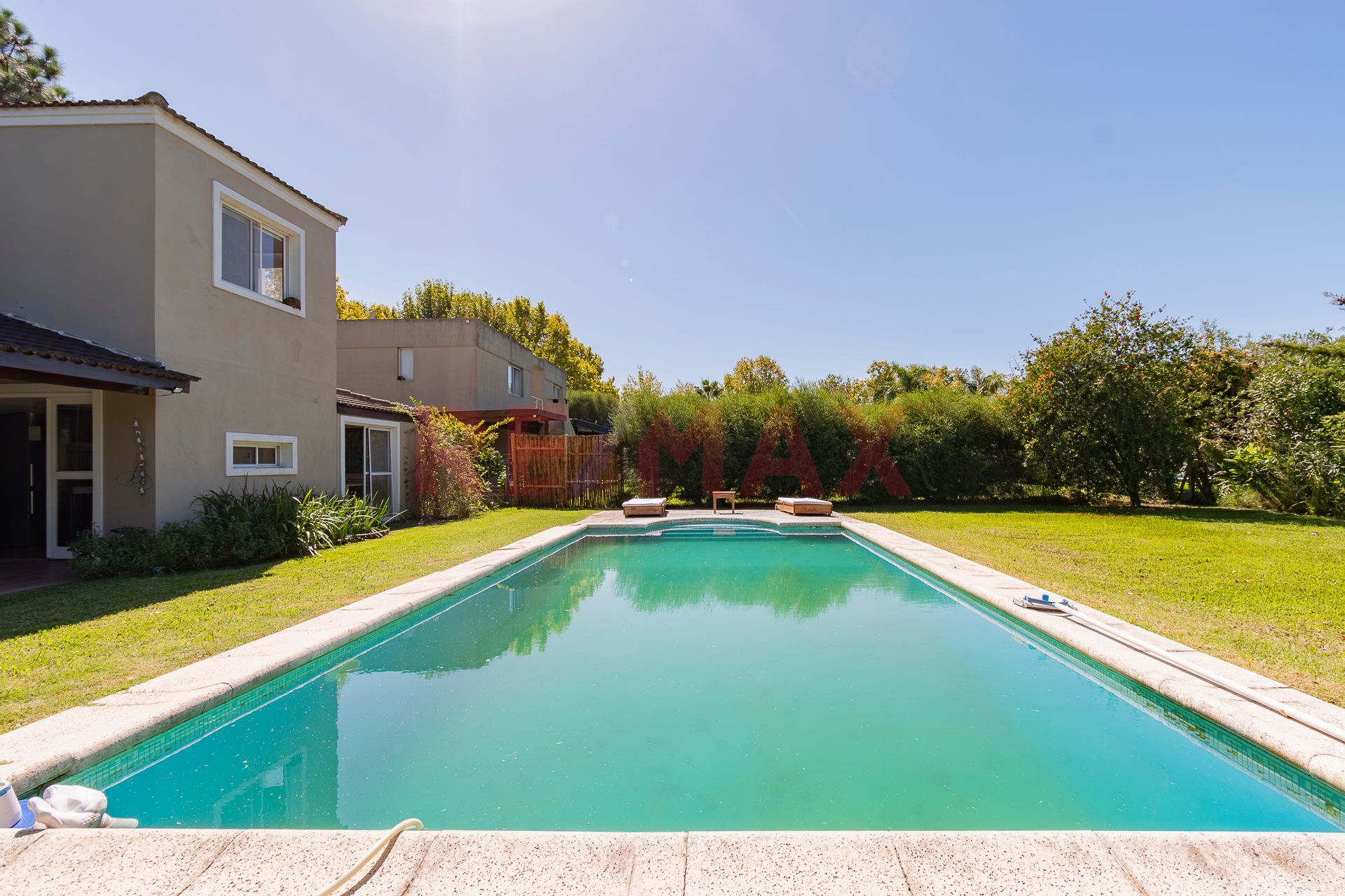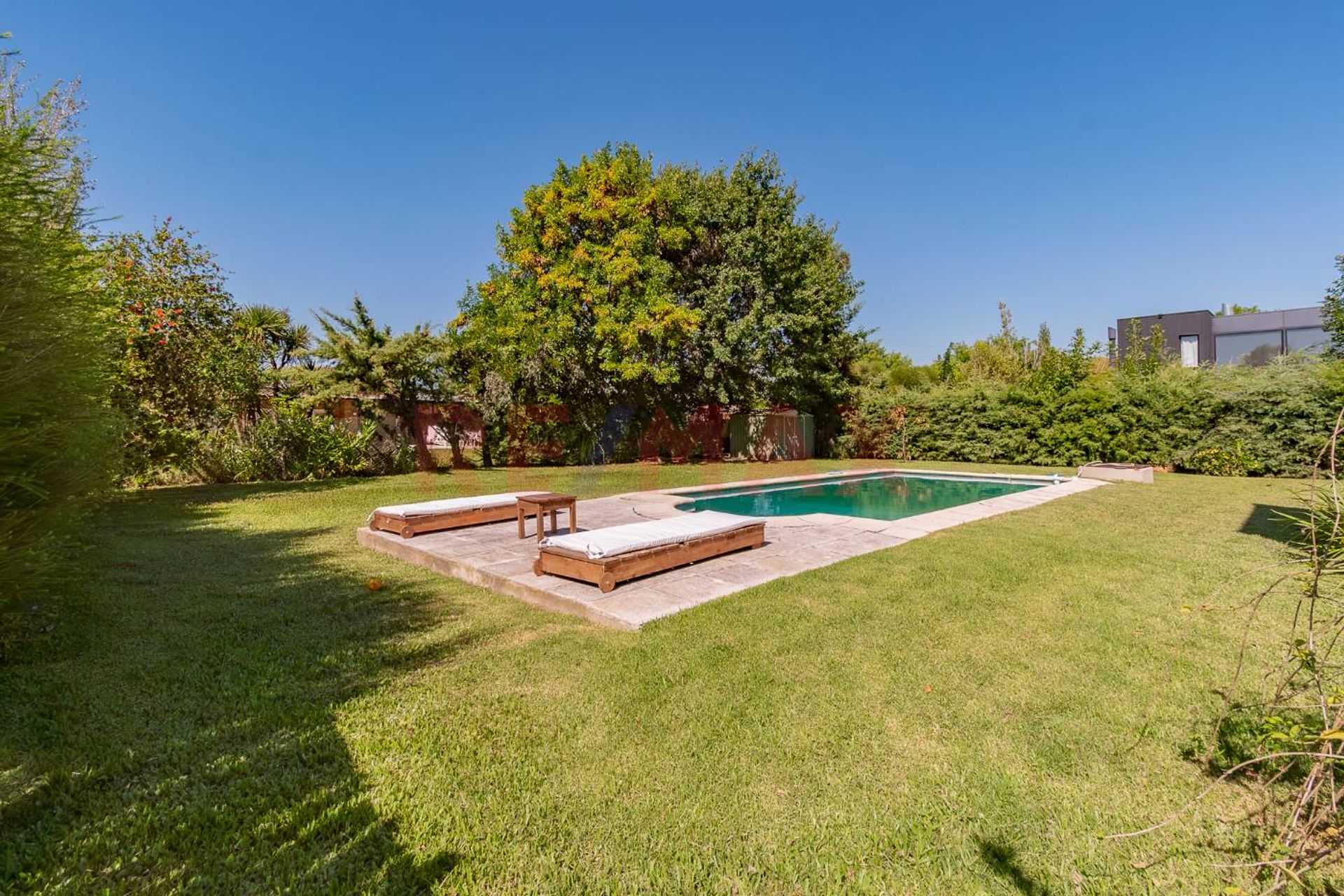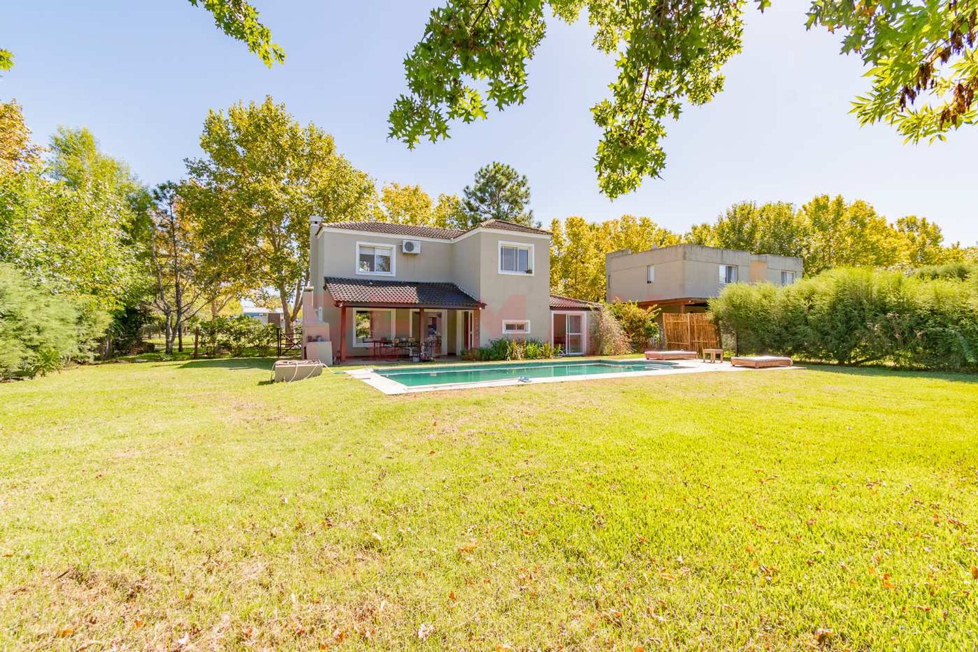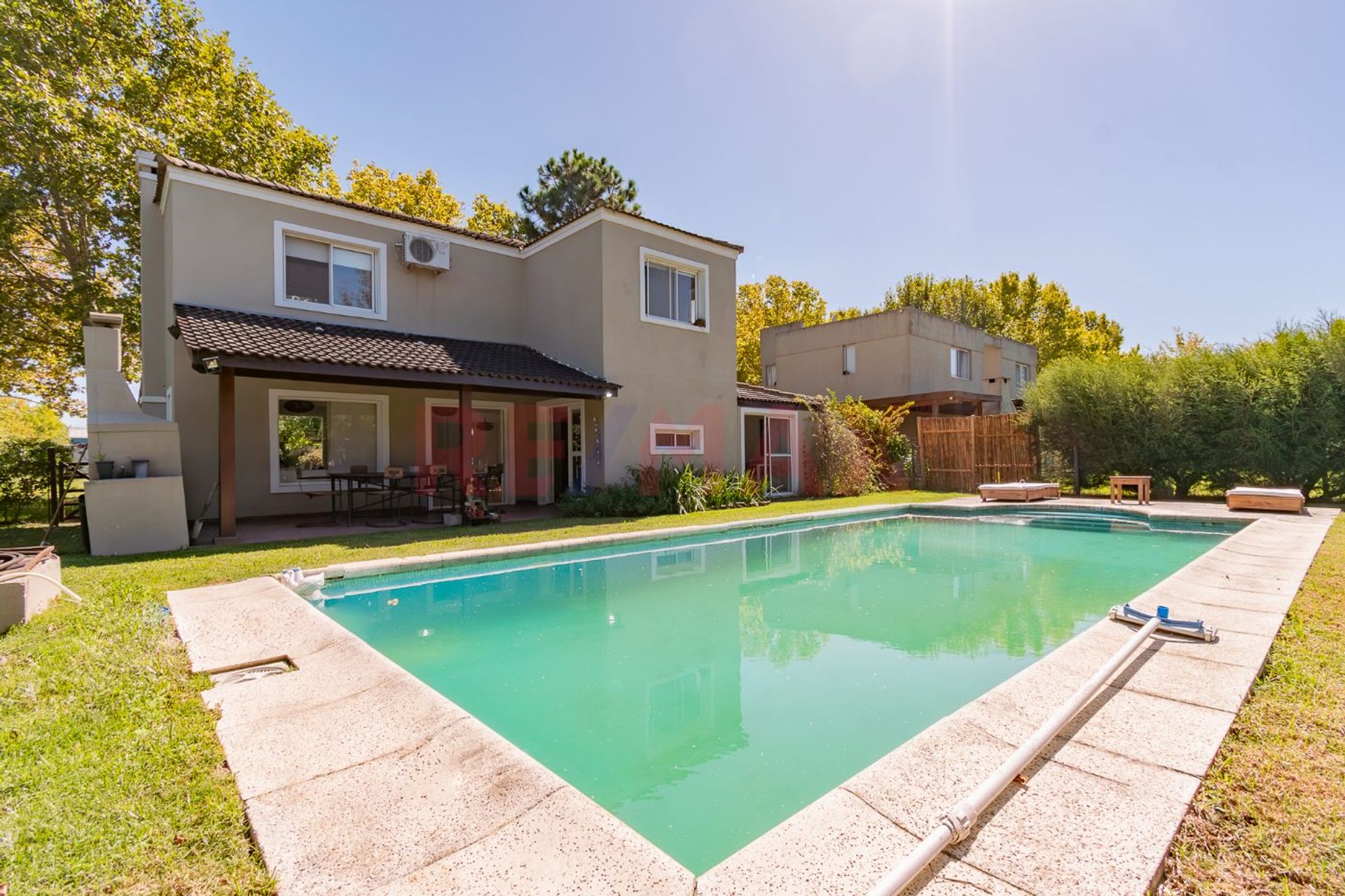 El sector exterior incluye una galería con parrilla, mesada de apoyo lateral y bacha, ideal para reuniones al aire libre. El gran lote está rodeado de cerco y vecinos consolidados, y dispone de una piscina de natación. El entorno se caracteriza por una laguna central y grandes árboles que brindan sombra y privacidad.