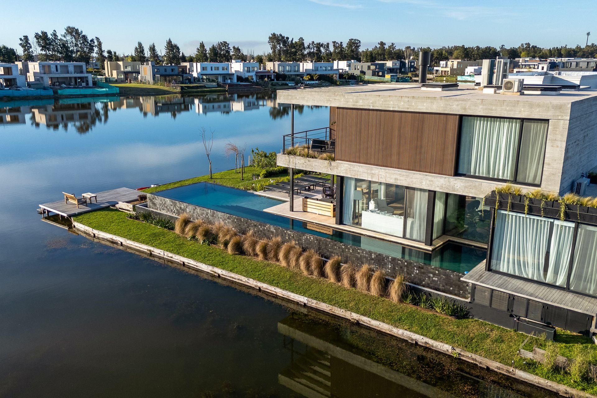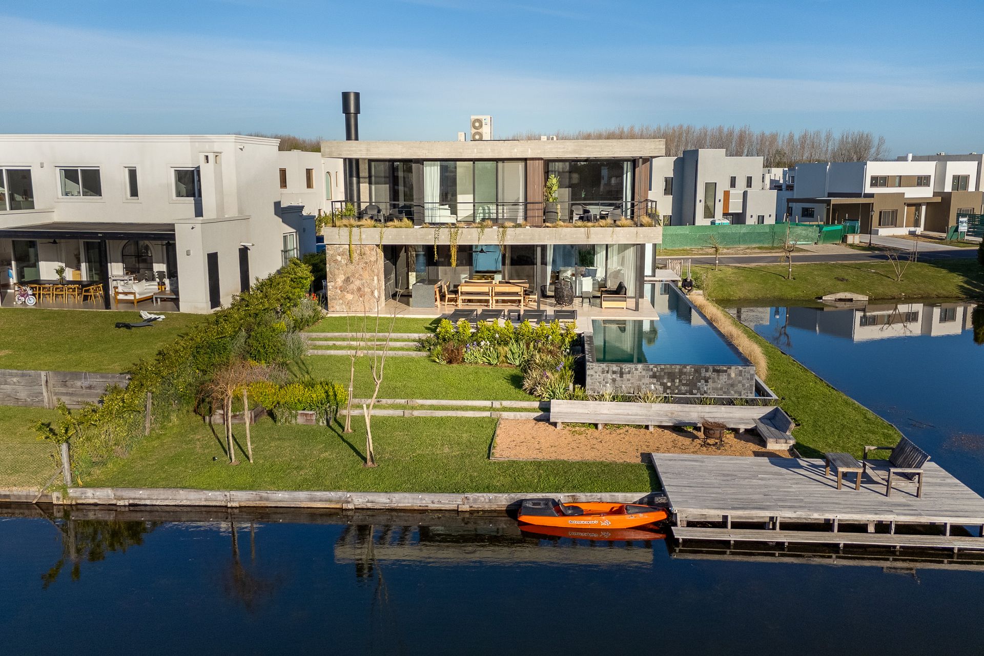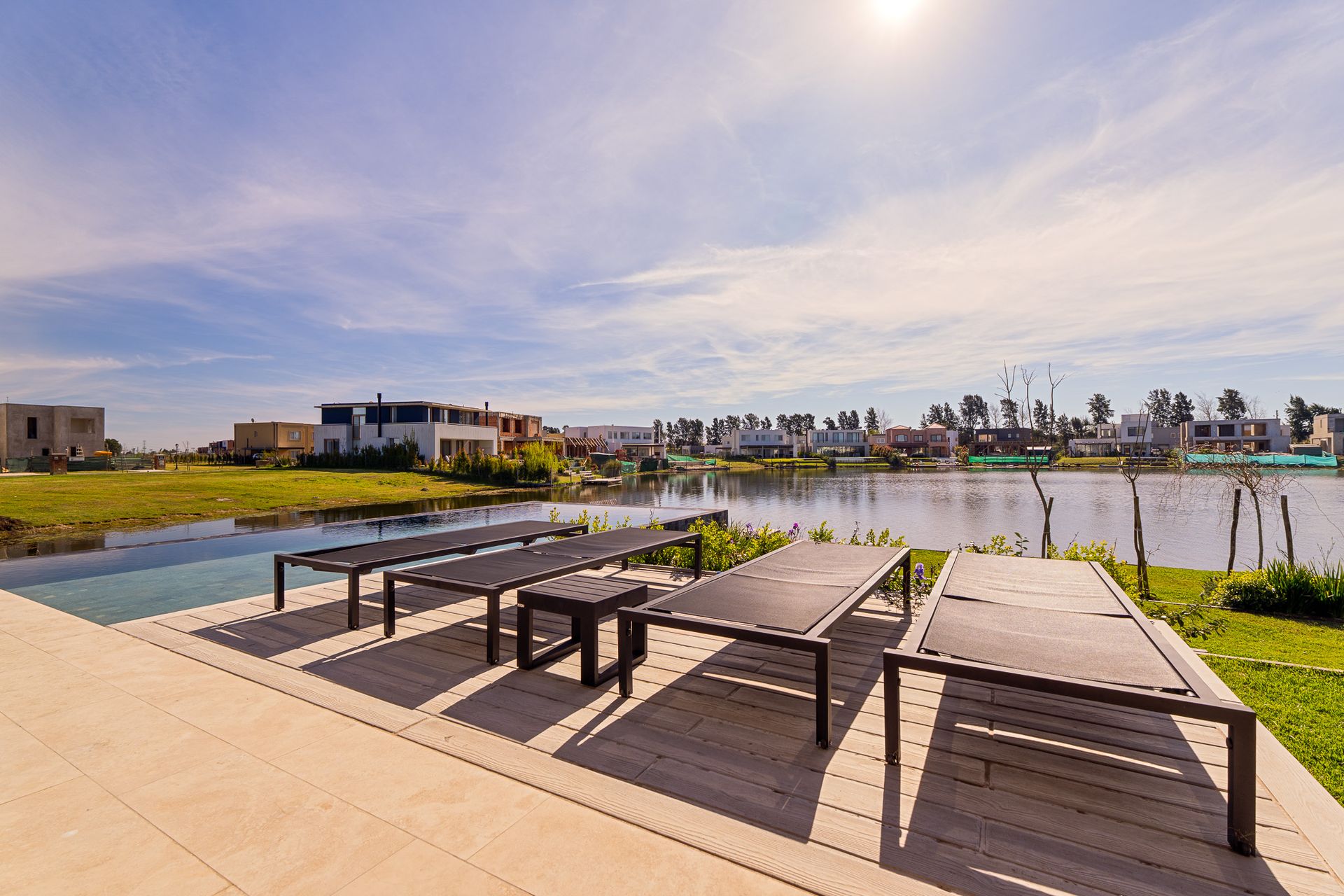 En el exterior, una amplia galería con parrilla, barra, mesa y living al aire libre brinda una vista abierta a la laguna. La pileta climatizada mide 20 metros de largo, complementada con solárium, fogonero con asientos para reuniones sociales y muelle privado equipado con sillón y kayak.