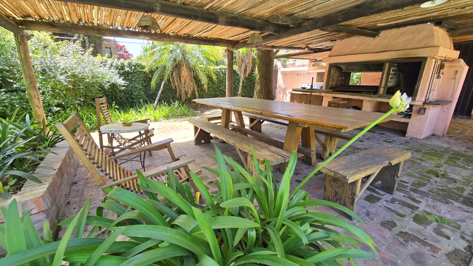 El exterior es un verdadero oasis: un jardín orientado al oeste que recibe sol toda la tarde, una pileta, una galería amplia, una parrilla y un sector especial para asados a la cruz. La zona, llena de árboles añosos, brinda una atmósfera de calma acompañada por el canto de los pájaros. El acceso es cómodo, con espacio semicubierto para dos autos y una garita de seguridad frente a la propiedad.