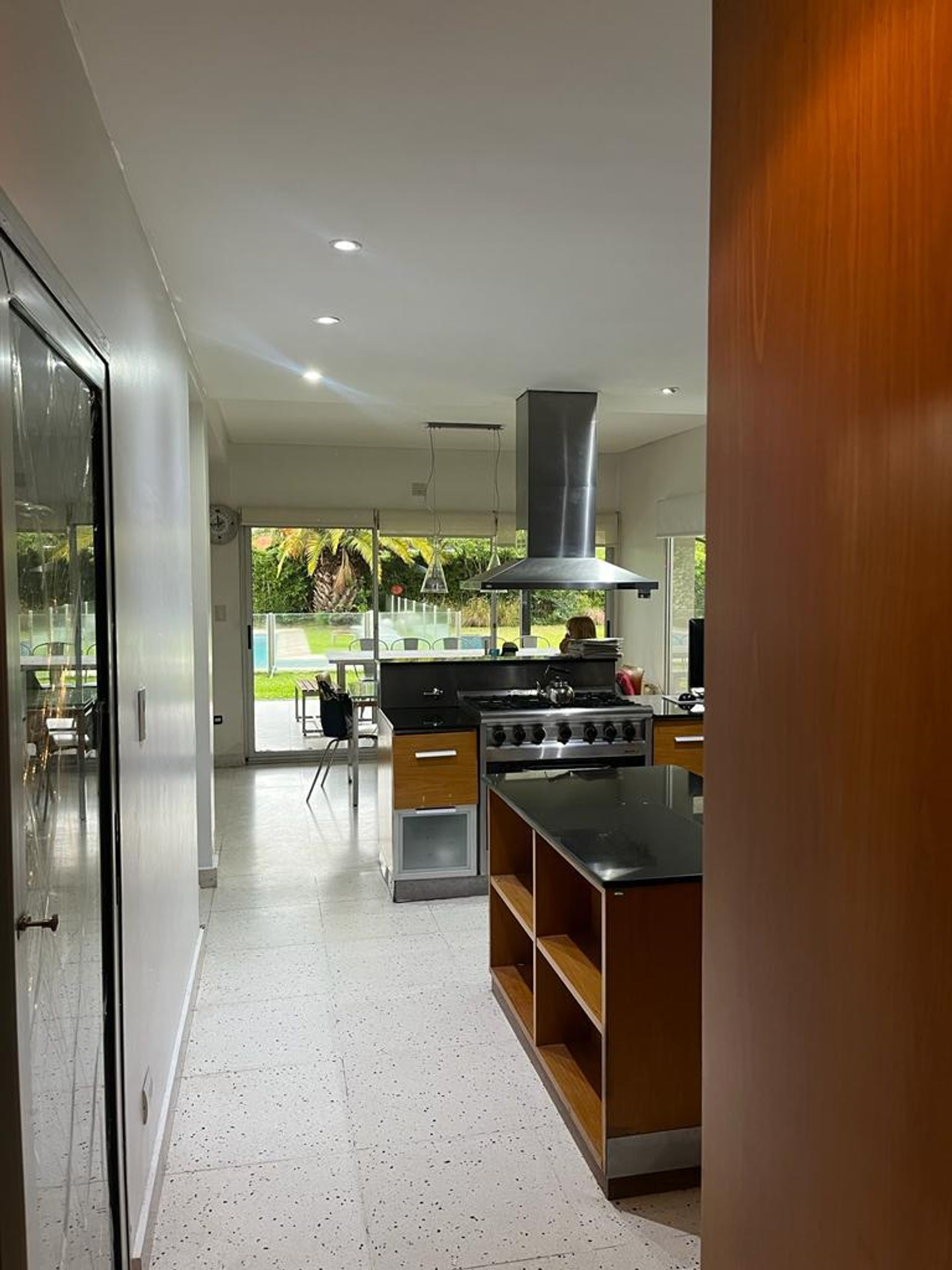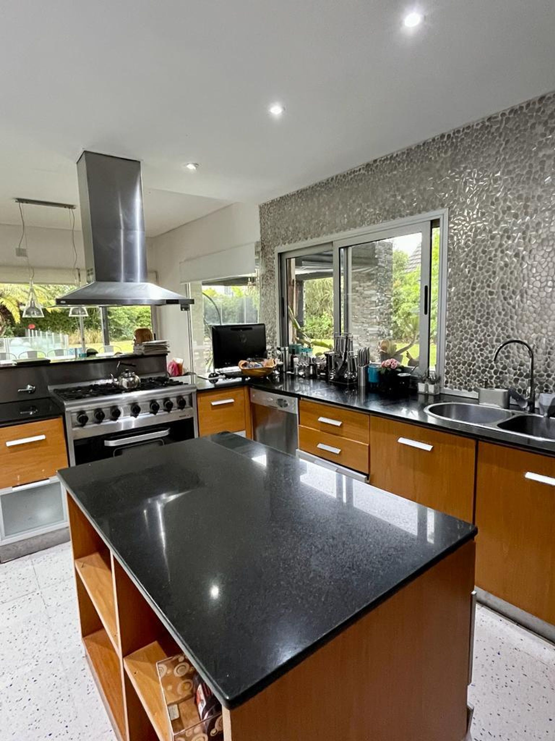 La cocina, de gran tamaño y totalmente equipada, dispone de heladera, lavavajillas, microondas y una isla central que invita a compartir comidas familiares. Se conecta directamente con el parque y la galería.