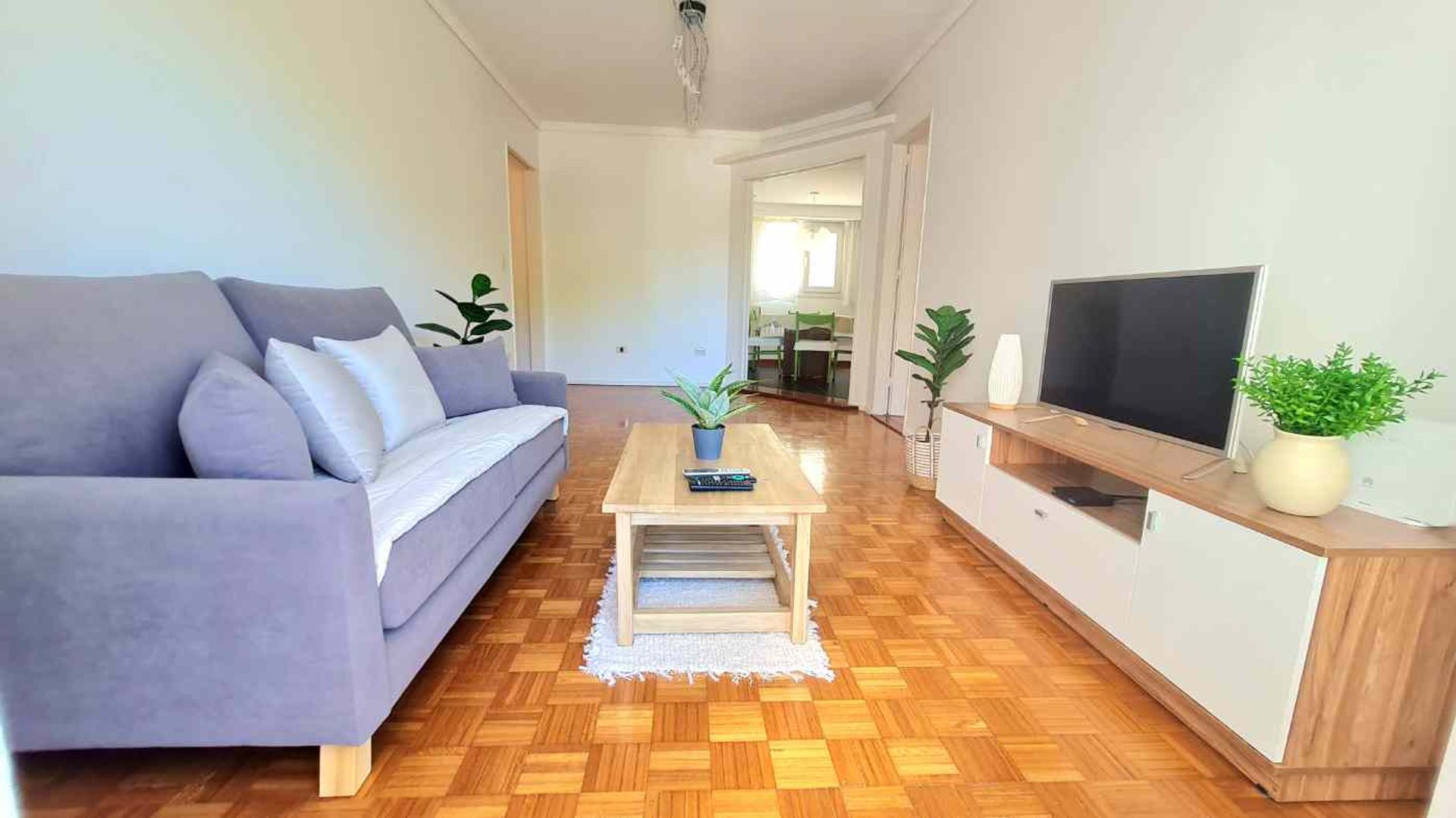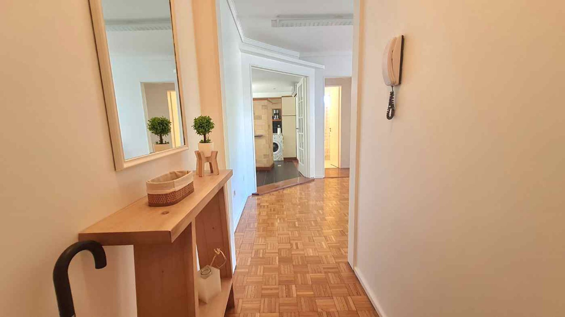 Al entrar se abre un espacioso pasillo que conduce a un luminoso living comedor con acceso directo al balcón, donde se puede disfrutar de la vista a los jardines y del canto de los pájaros. La cocina, con barra desayunadora y lavavajillas, está al lado y cuenta con electrodomésticos completos.