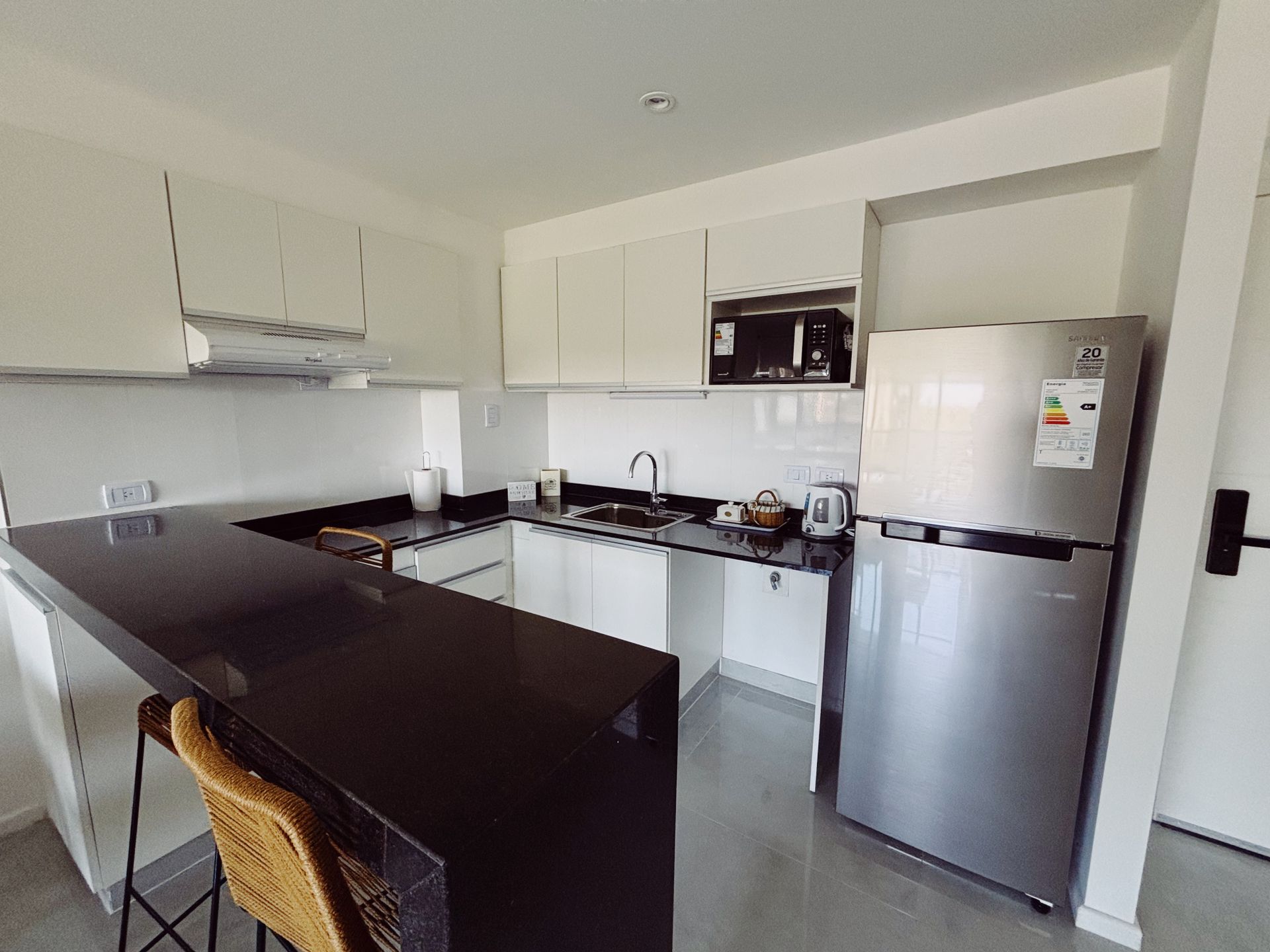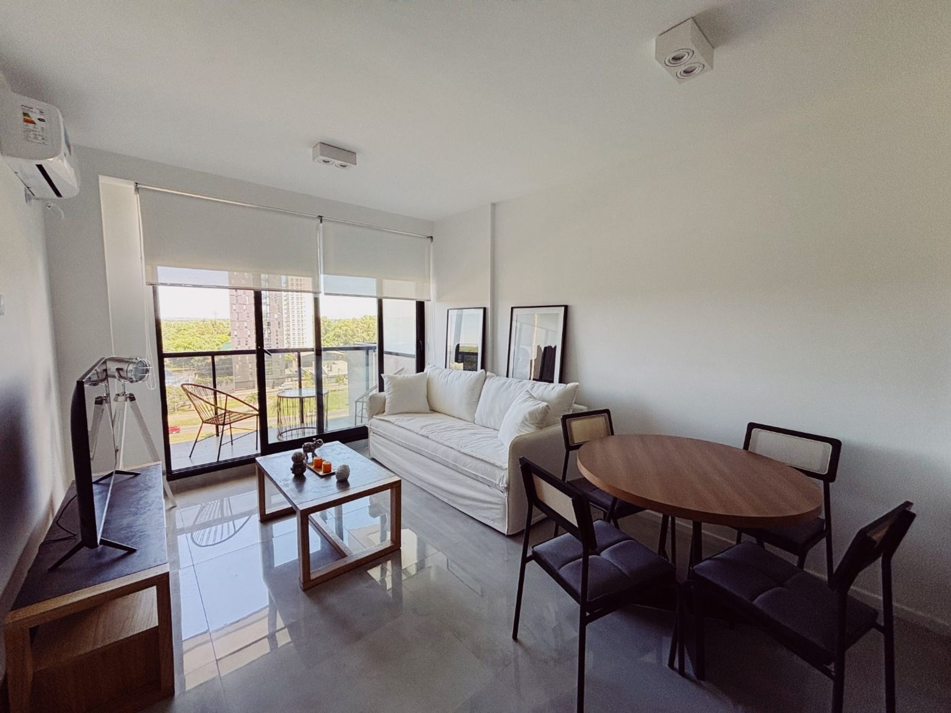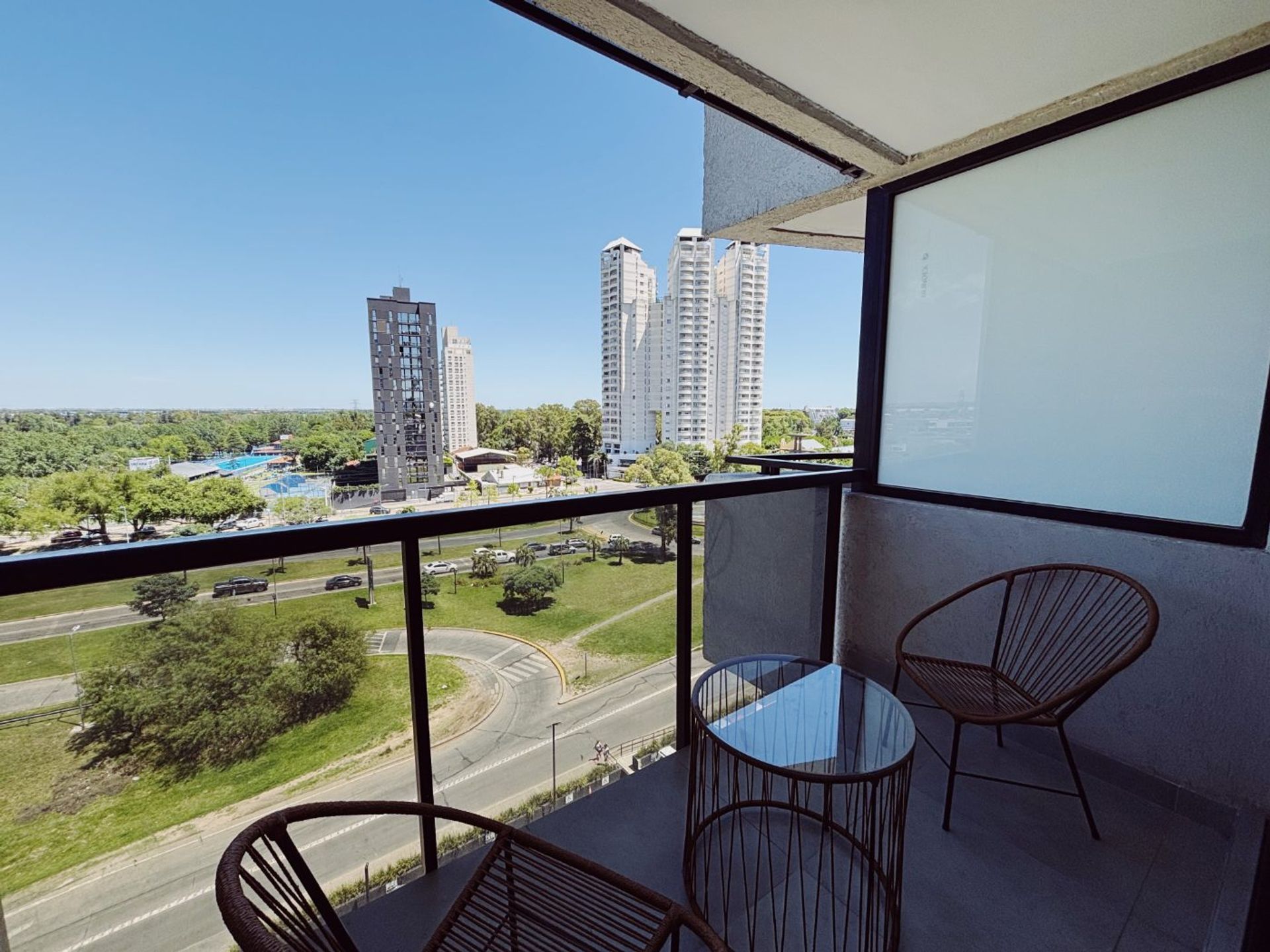 El dormitorio cuenta con placard amplio y ventanales que aportan excelente iluminación natural, además de ropa de cama y toallas incluidas. La cocina integrada está equipada con electrodomésticos nuevos, mientras que el living-comedor dispone de sofá, mesa con cuatro sillas y televisión. El baño completo presenta accesorios modernos y bañera. Un balcón con vistas abiertas invita a disfrutar del aire libre. Aire acondicionado frío/calor en living y dormitorio. La cochera privada garantiza comodidad y seguridad.