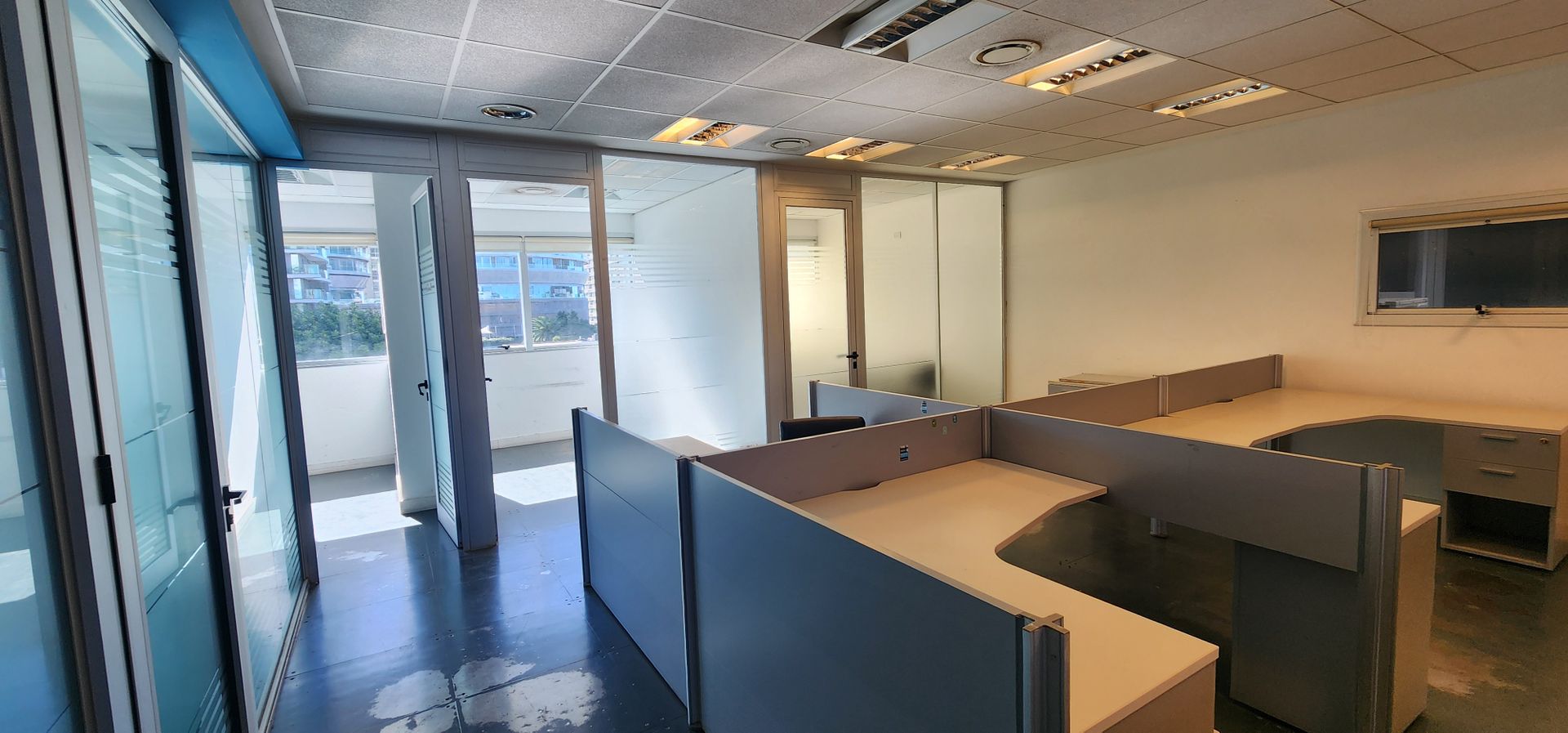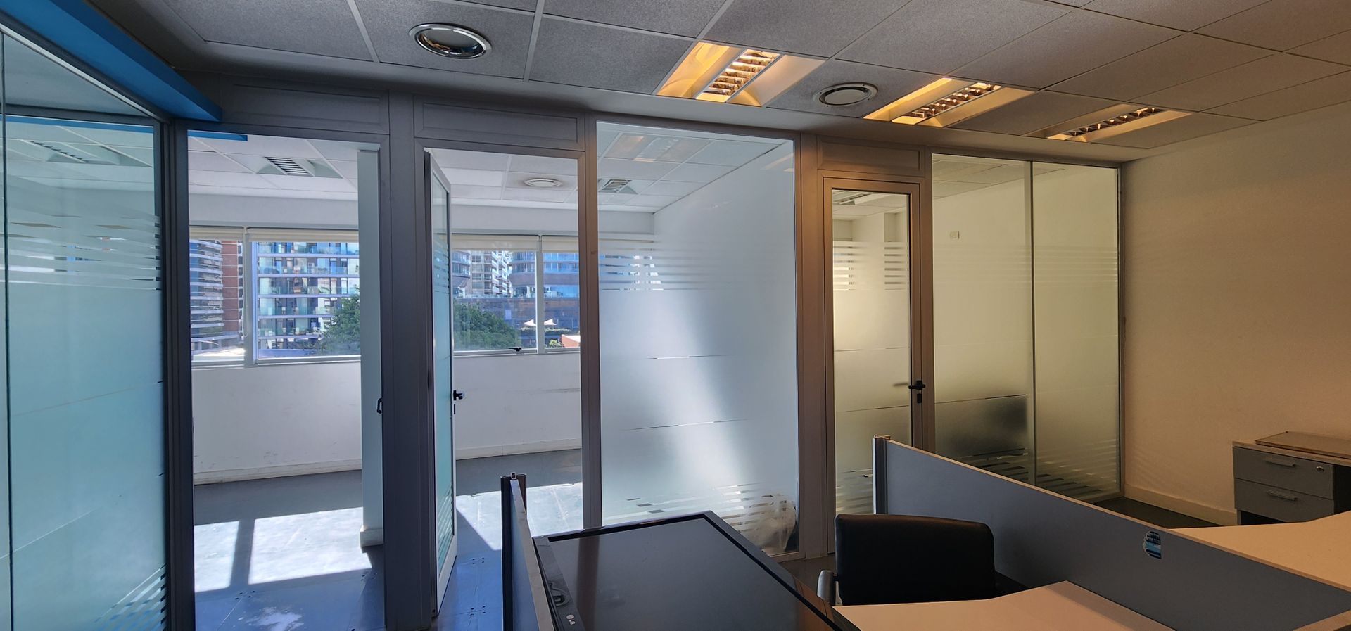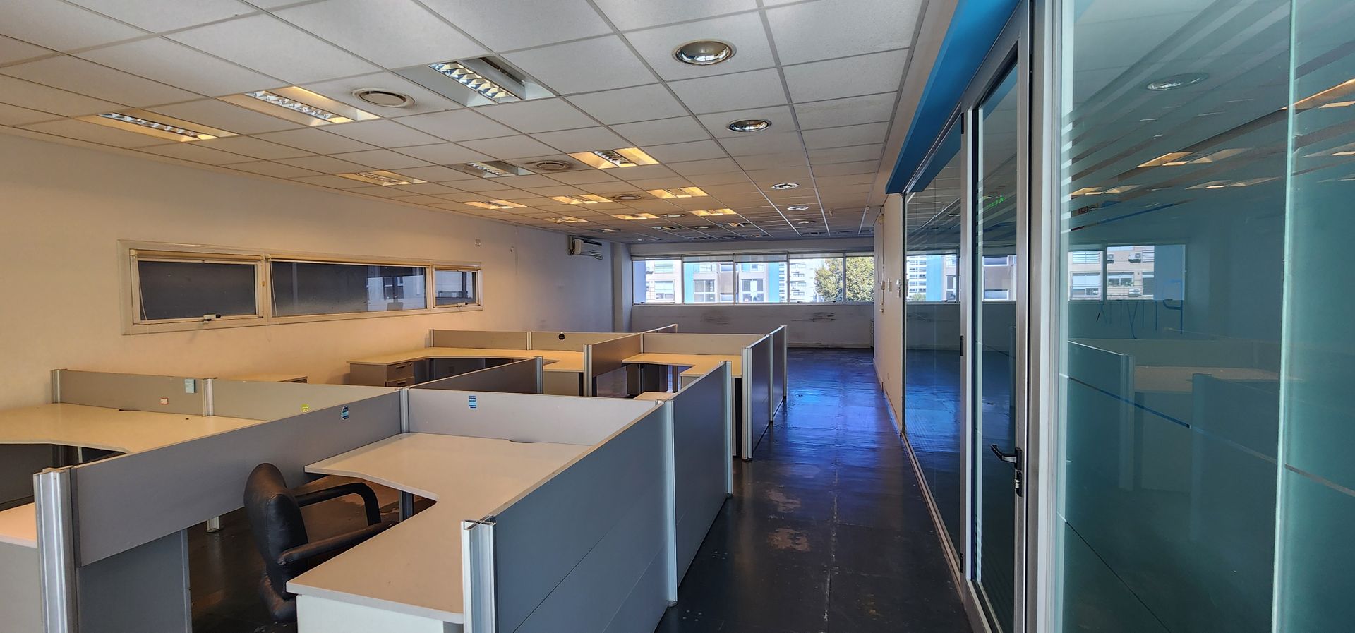 La oficina está situada en el cuarto piso y ofrece vistas tanto frente como contrafrente. Su superficie aproximada es de 130 m², distribuida en tres espacios de oficina separados por divisiones de vidrio. Incluye piso técnico, aire acondicionado central con regulación individual de frío y calor, dos baños y un área de oficina. El estacionamiento en el subsuelo está incluido.
