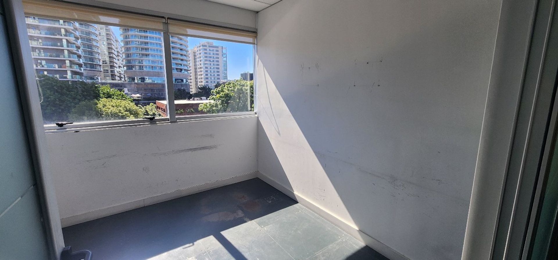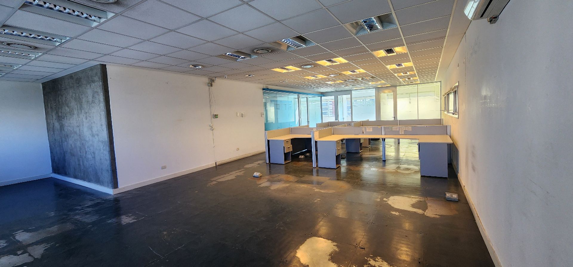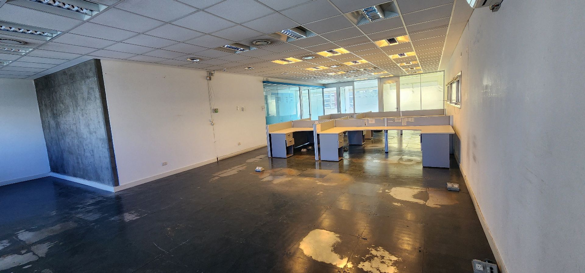 La oficina está situada en el cuarto piso y ofrece vistas tanto frente como contrafrente. Su superficie aproximada es de 130 m², distribuida en tres espacios de oficina separados por divisiones de vidrio. Incluye piso técnico, aire acondicionado central con regulación individual de frío y calor, dos baños y un área de oficina. El estacionamiento en el subsuelo está incluido.