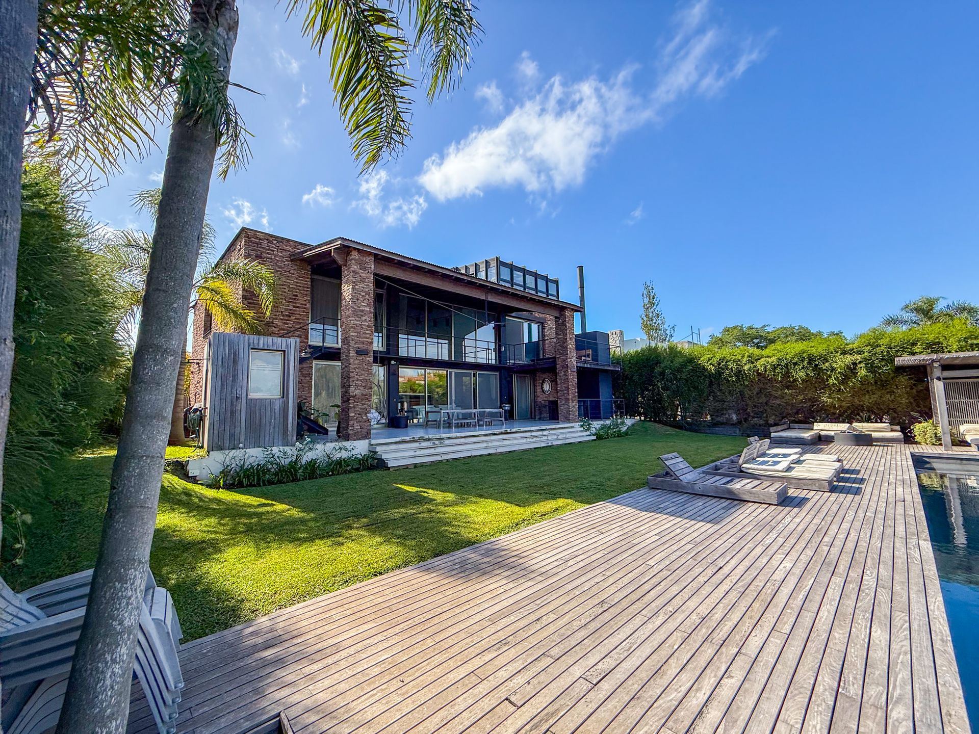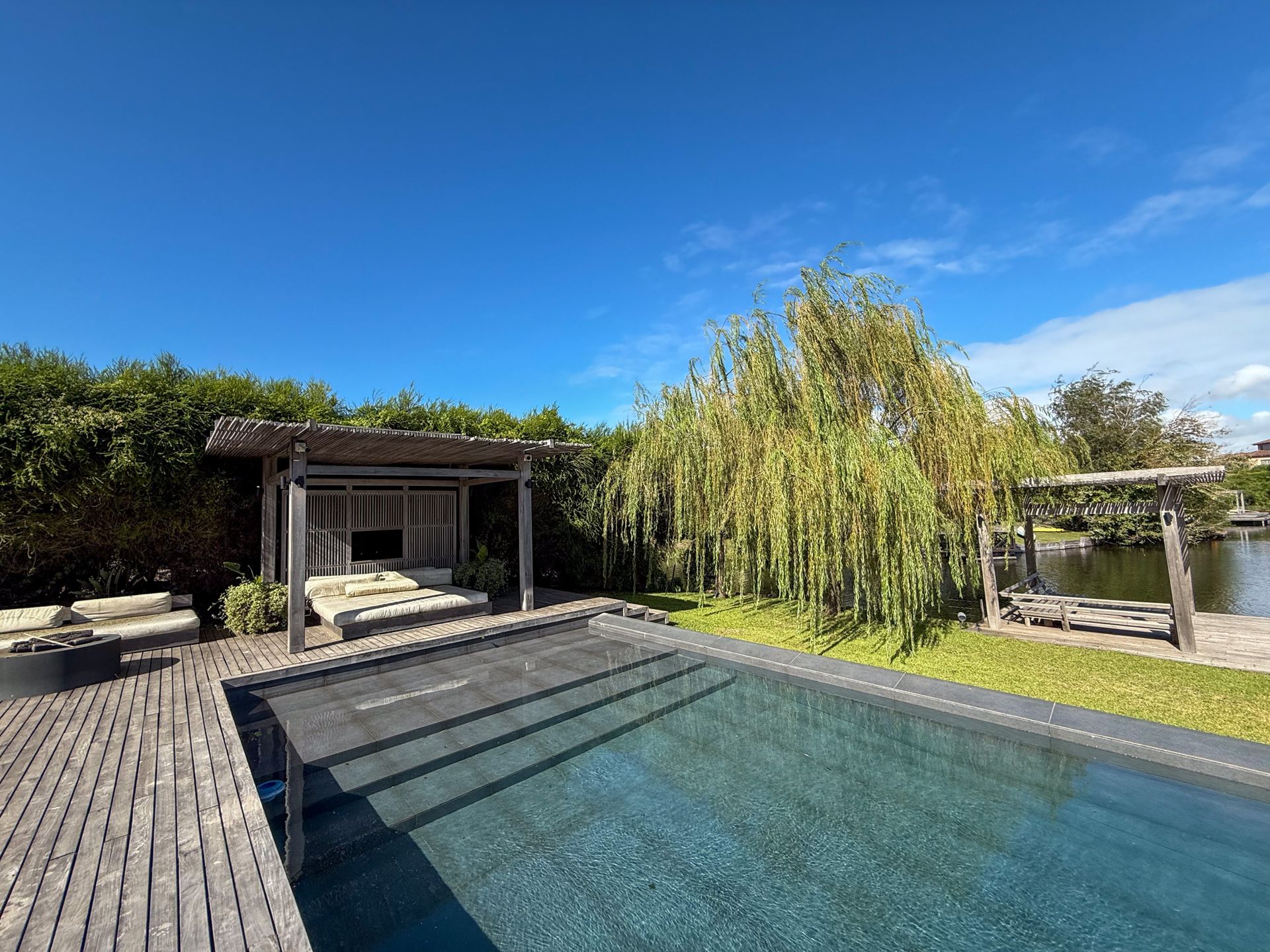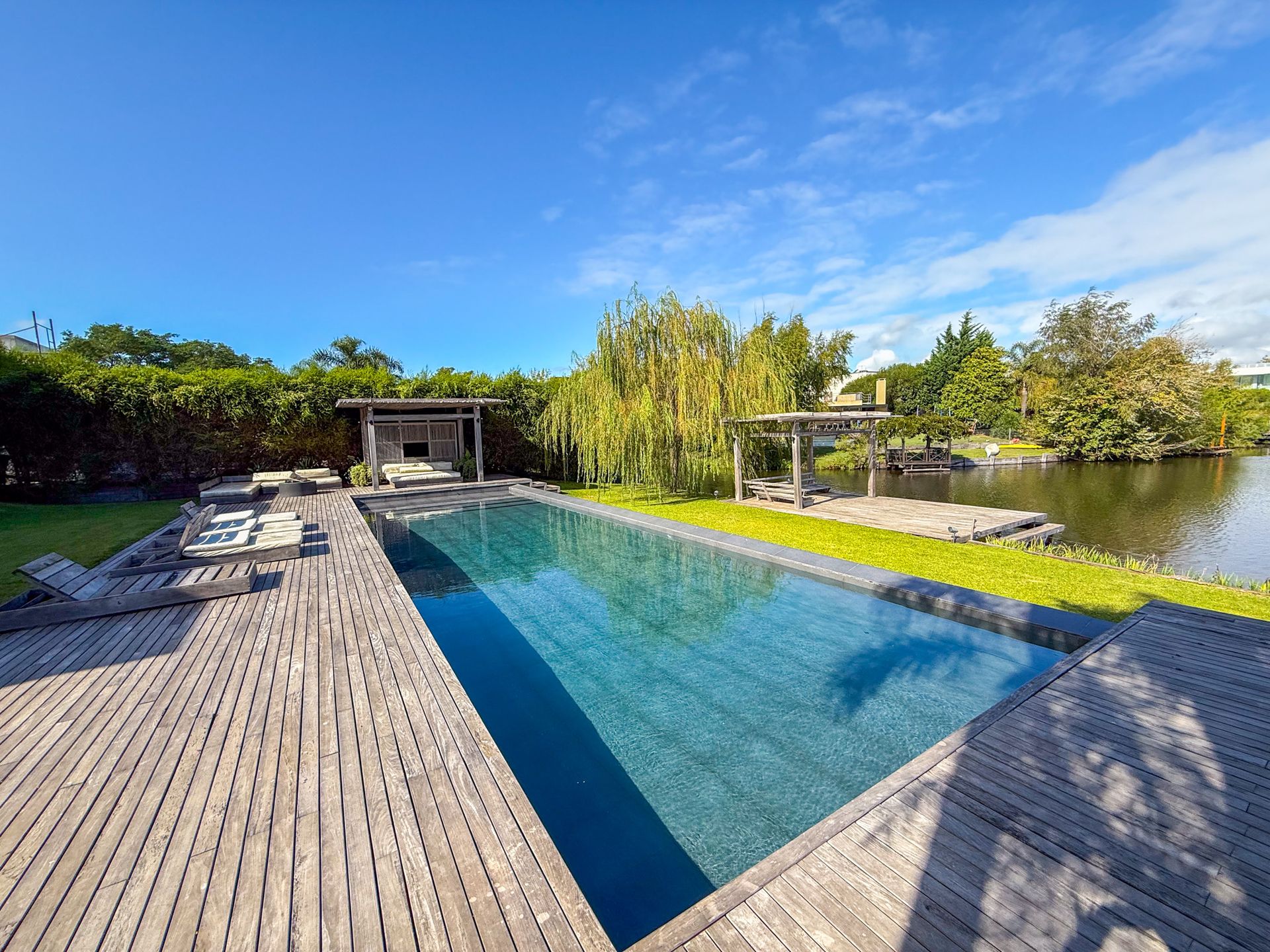 El primer nivel presenta un amplio living principal con vidrieras que enmarcan la vista al lago, un segundo living con televisor y una cocina amplia equipada con isla, cafetera y electrodomésticos Smeg, incluyendo tres hornos. El comedor diario abre a la galería cubierta, donde se encuentra una parrilla y una pérgola con solárium. Se dispone de lavadero independiente, habitación de servicio con baño completo y un escritorio con toilette.