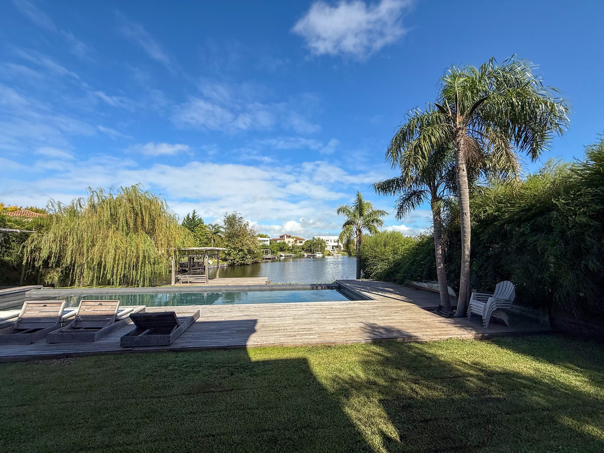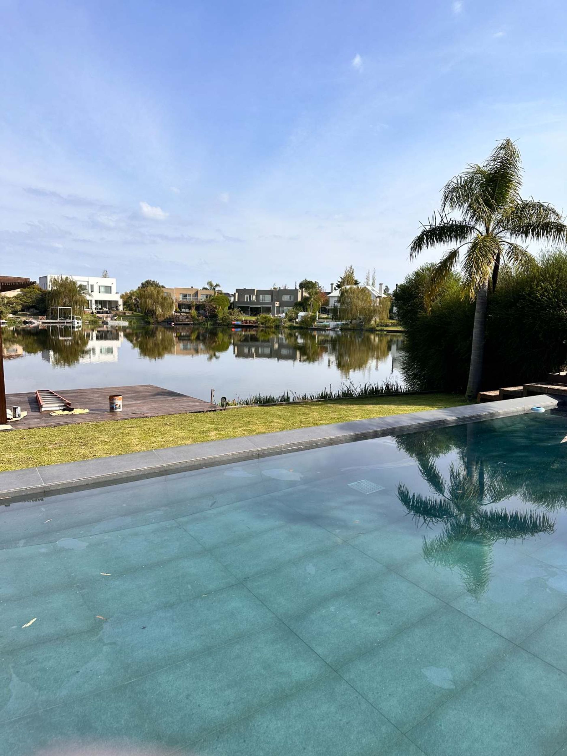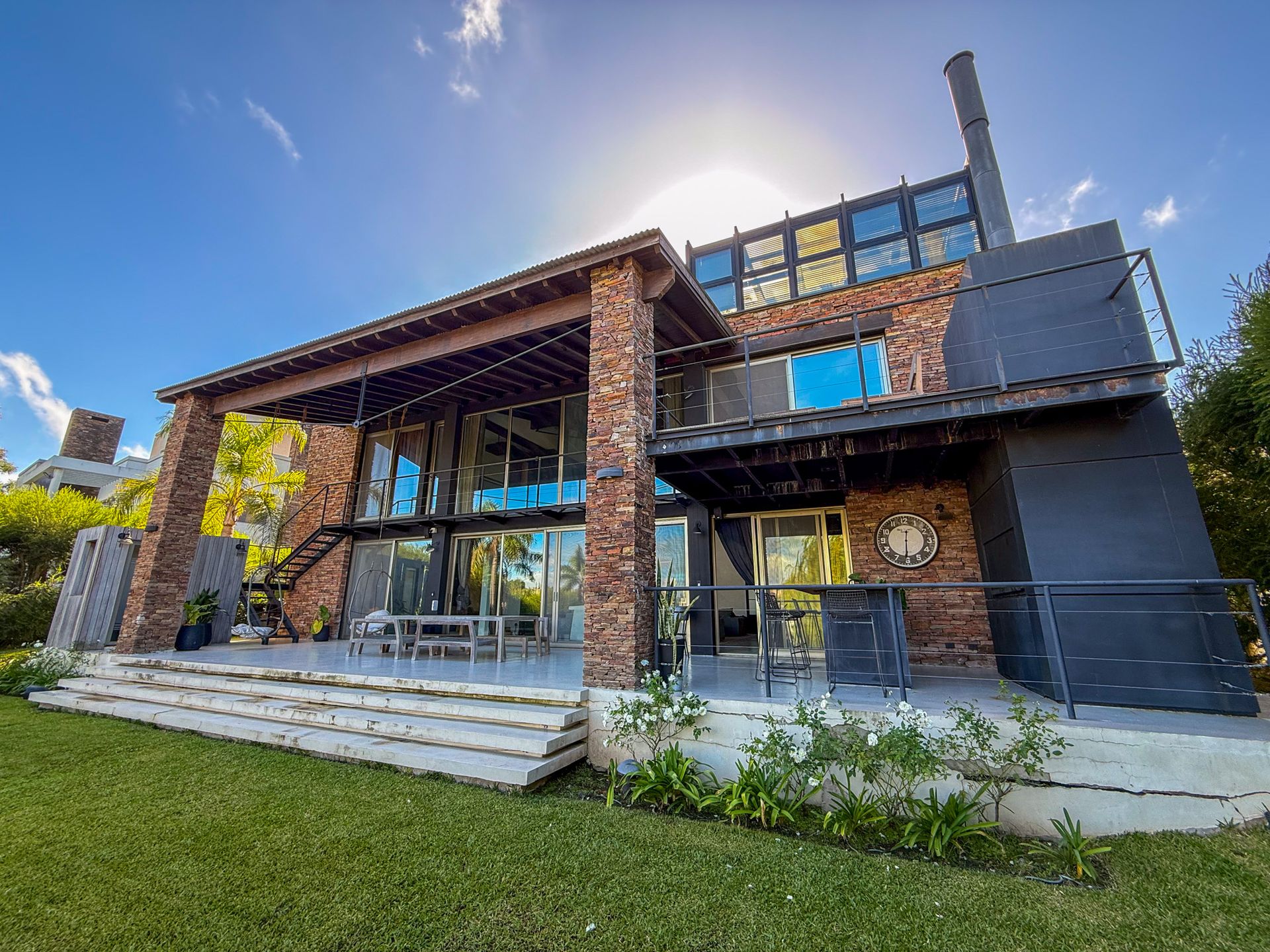 El primer nivel presenta un amplio living principal con vidrieras que enmarcan la vista al lago, un segundo living con televisor y una cocina amplia equipada con isla, cafetera y electrodomésticos Smeg, incluyendo tres hornos. El comedor diario abre a la galería cubierta, donde se encuentra una parrilla y una pérgola con solárium. Se dispone de lavadero independiente, habitación de servicio con baño completo y un escritorio con toilette.