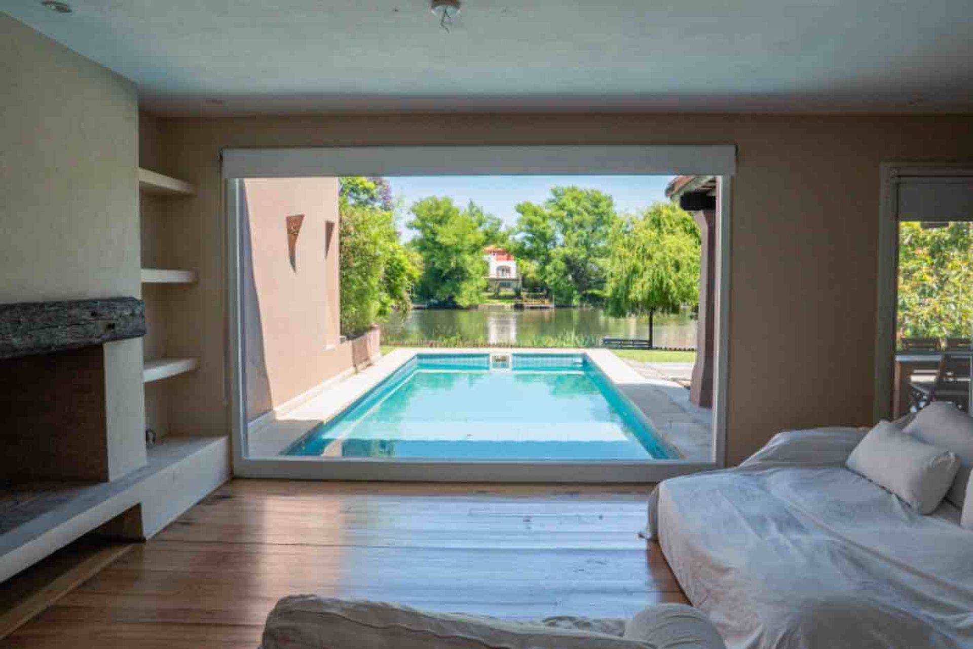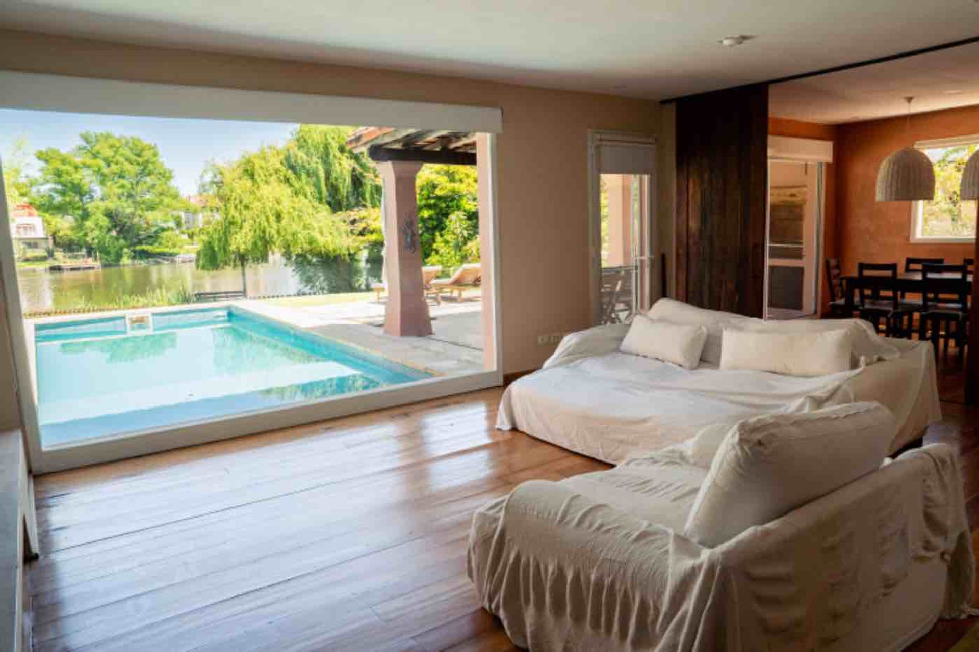 En la planta baja se encuentran un amplio living comedor, una cocina integrada con lavadero, una dependencia de servicio con baño y una master suite que cuenta con vestidor y escritorio. El jardín, de gran extensión, alberga una pileta climatizada, la laguna y el muelle, creando un espacio ideal para disfrutar del clima y la vista acuática.